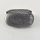 Pilleæske i tin med motiv af en dreng og en hund omgivet af bladmotiver