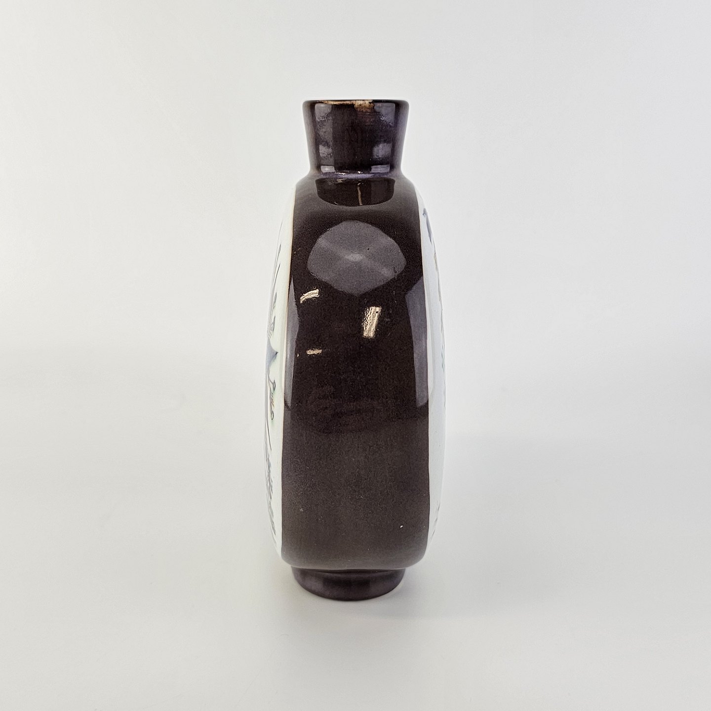 Rund flad vase fra serien Tenera. Vasen er i fajance med motiv af en fugl