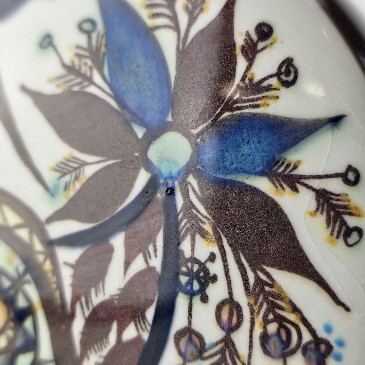 Fremstår med en misfarvning ved kanten, diverse små nister i overfladen, og en krakelering