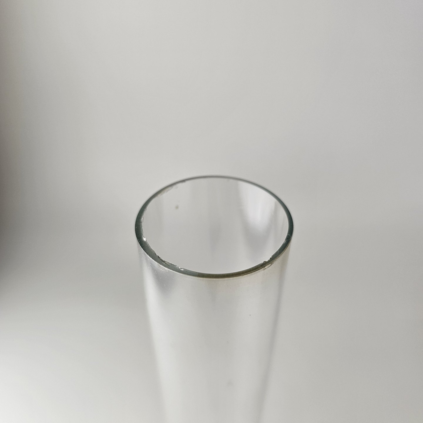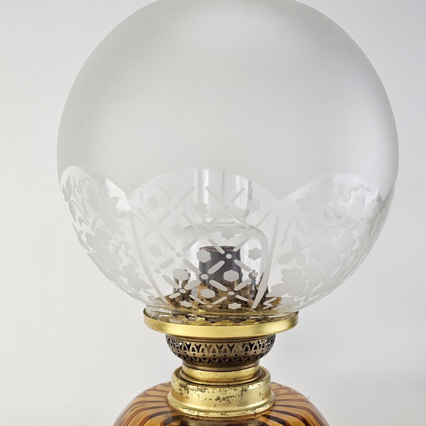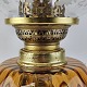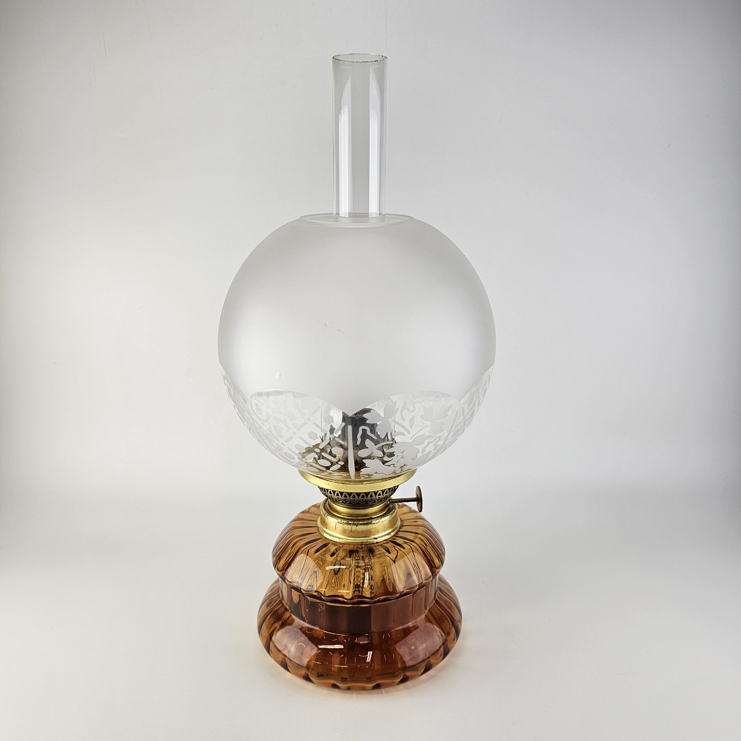 Glas ravfarvet petroliumslampe til bord model Dagmar Maxi med glasrør og rund kuppel i klar glas. Lille afslag på kuppelskærm i fod, som ikke ses.