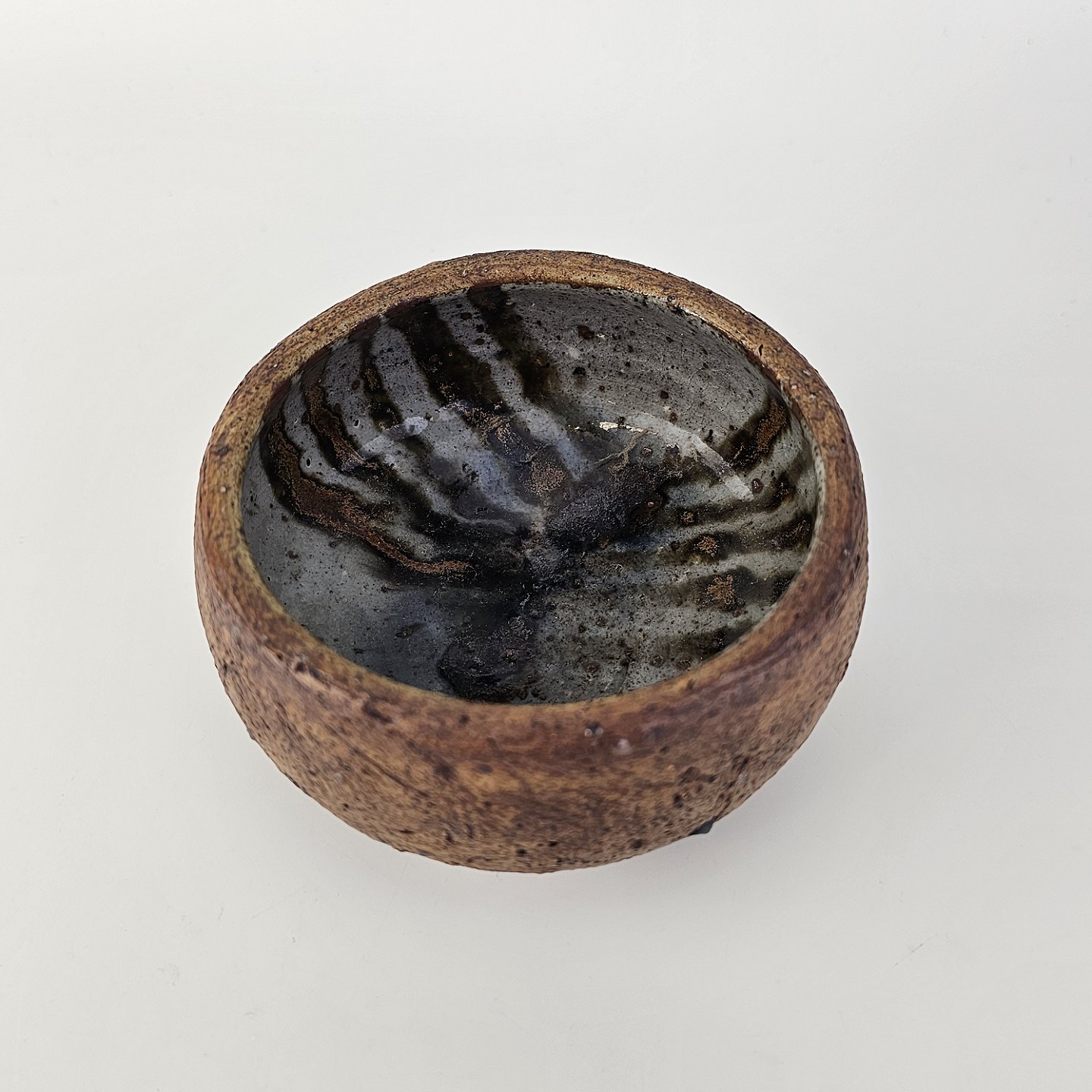 Lille skål i keramik med uglaseret yderside og glaseret inderside med abstrakt mønster i gråbrune farver.