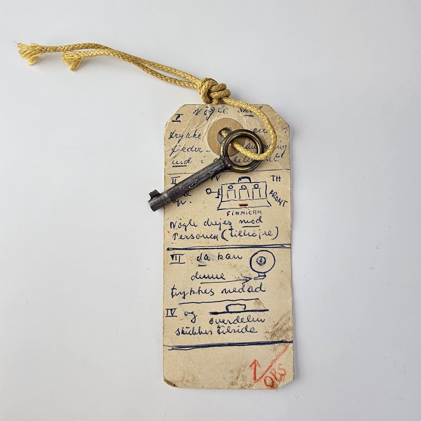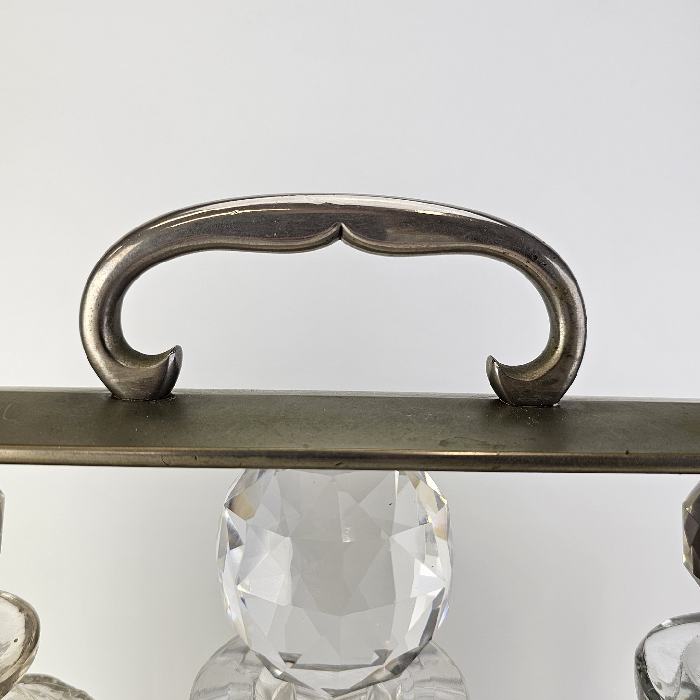 Tantelus med 3 firkantede karafler, formentlig ikke originale, da der er forskel på dem. Med rund glas kugleformet prob. Lås virker fint.