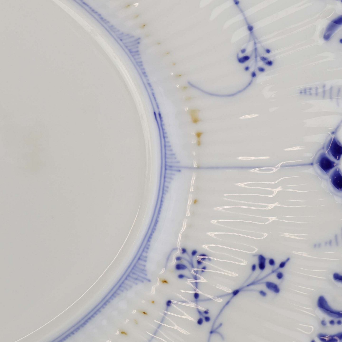 Musselmalet halvblonde er riflet hvidt porcelæn med dekoration af blå ranker og en kant med blonder.