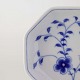 Service i hvidt skælformet porcelæn med blå motiver af blomster og sommerfugle.
