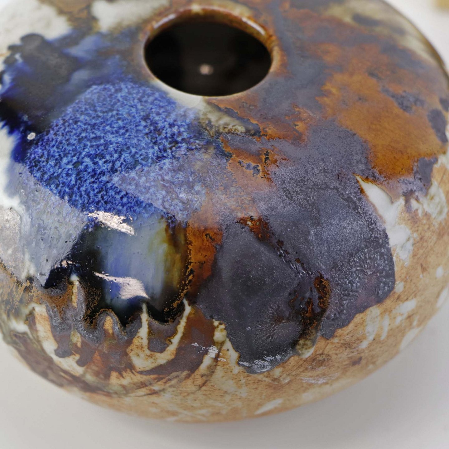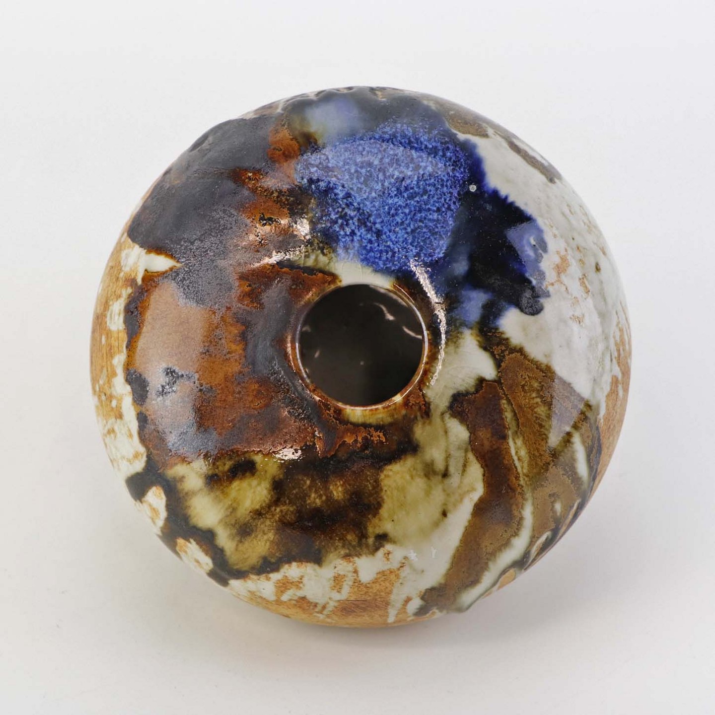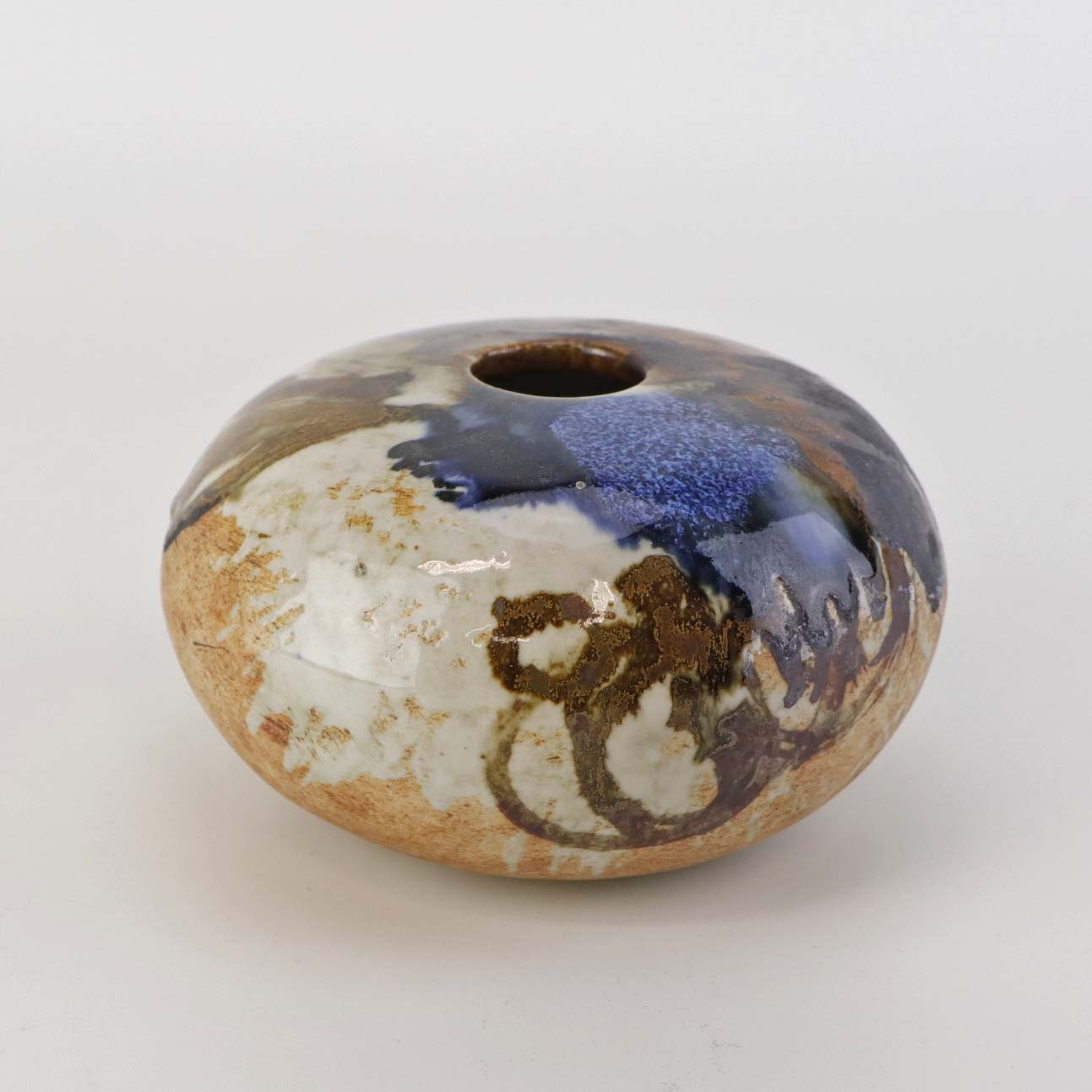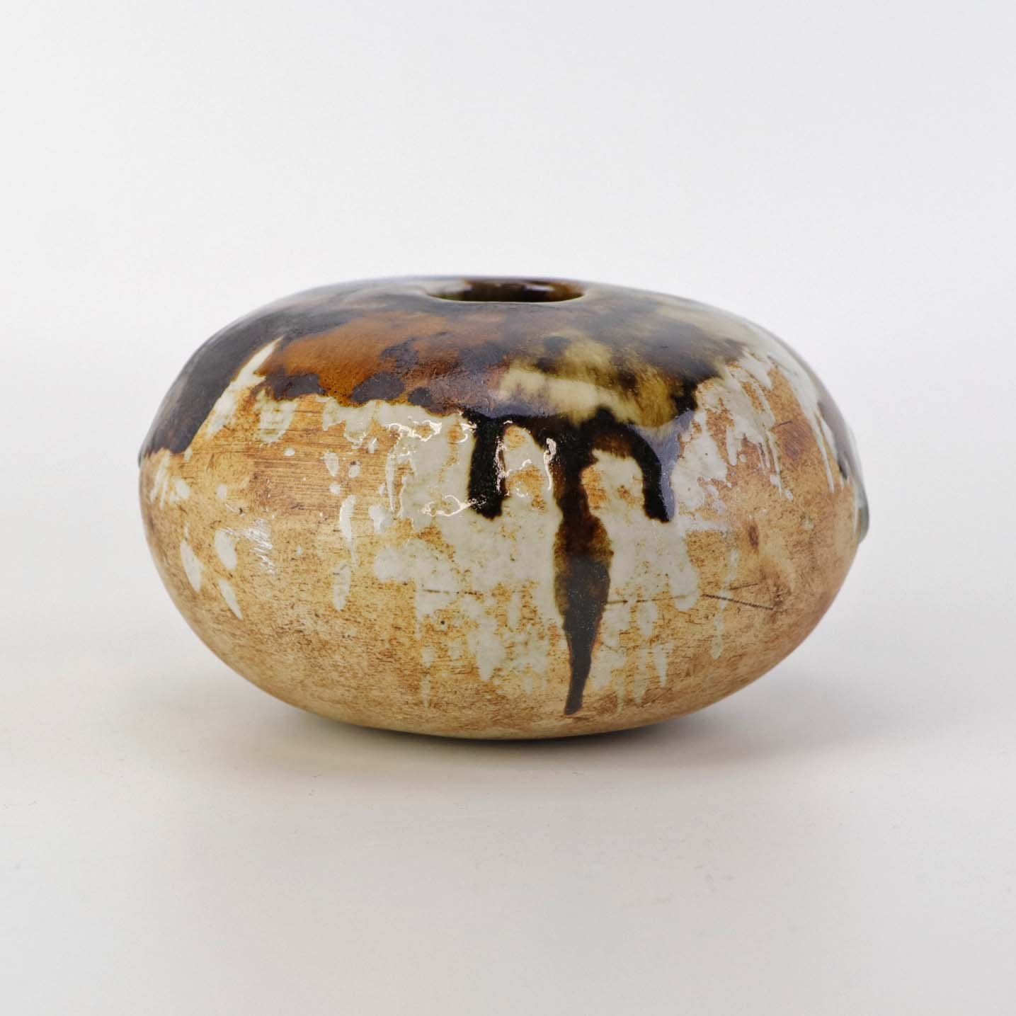 Lav rund vase i keramik. Delvist glaseret med flerfarvet mat og glansfuld glasur.