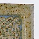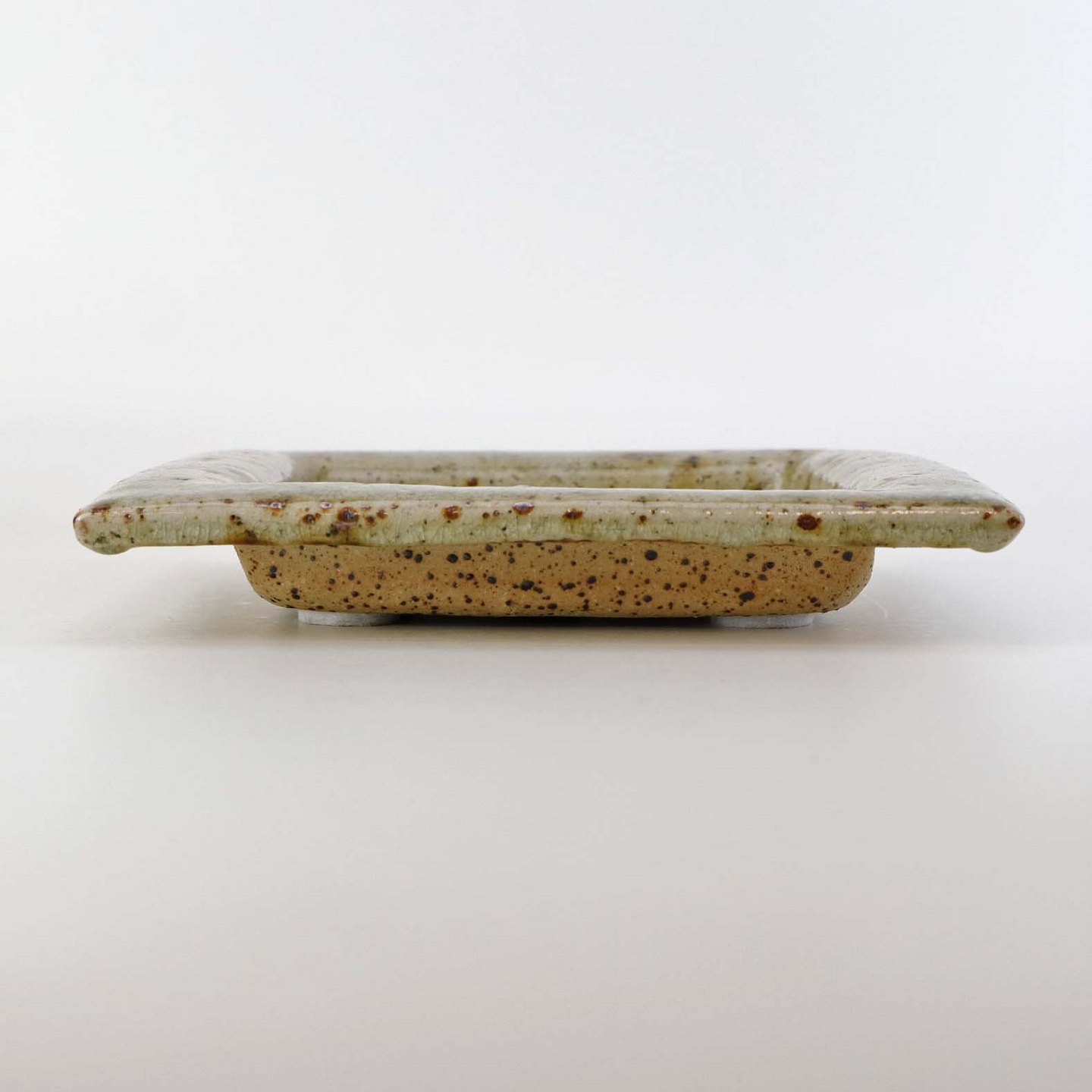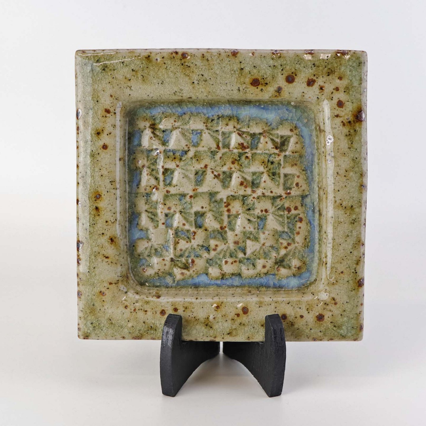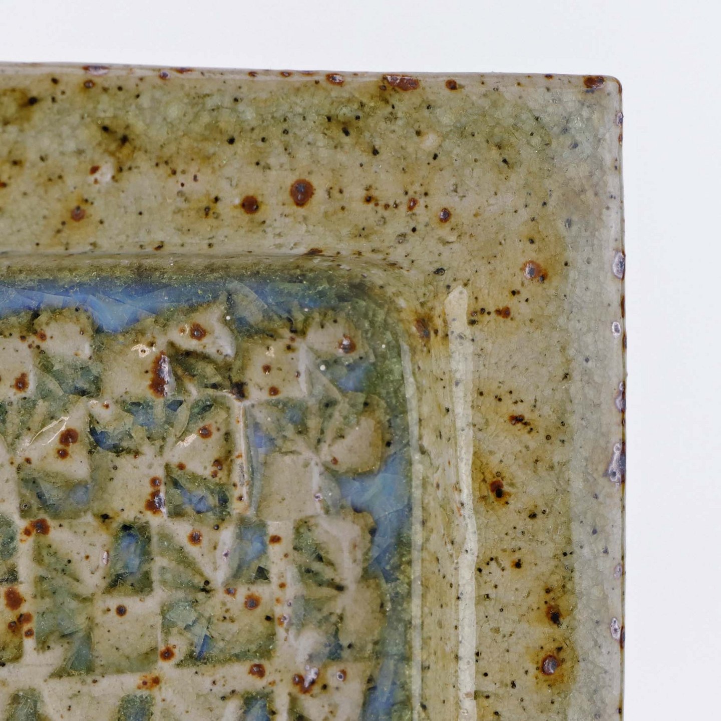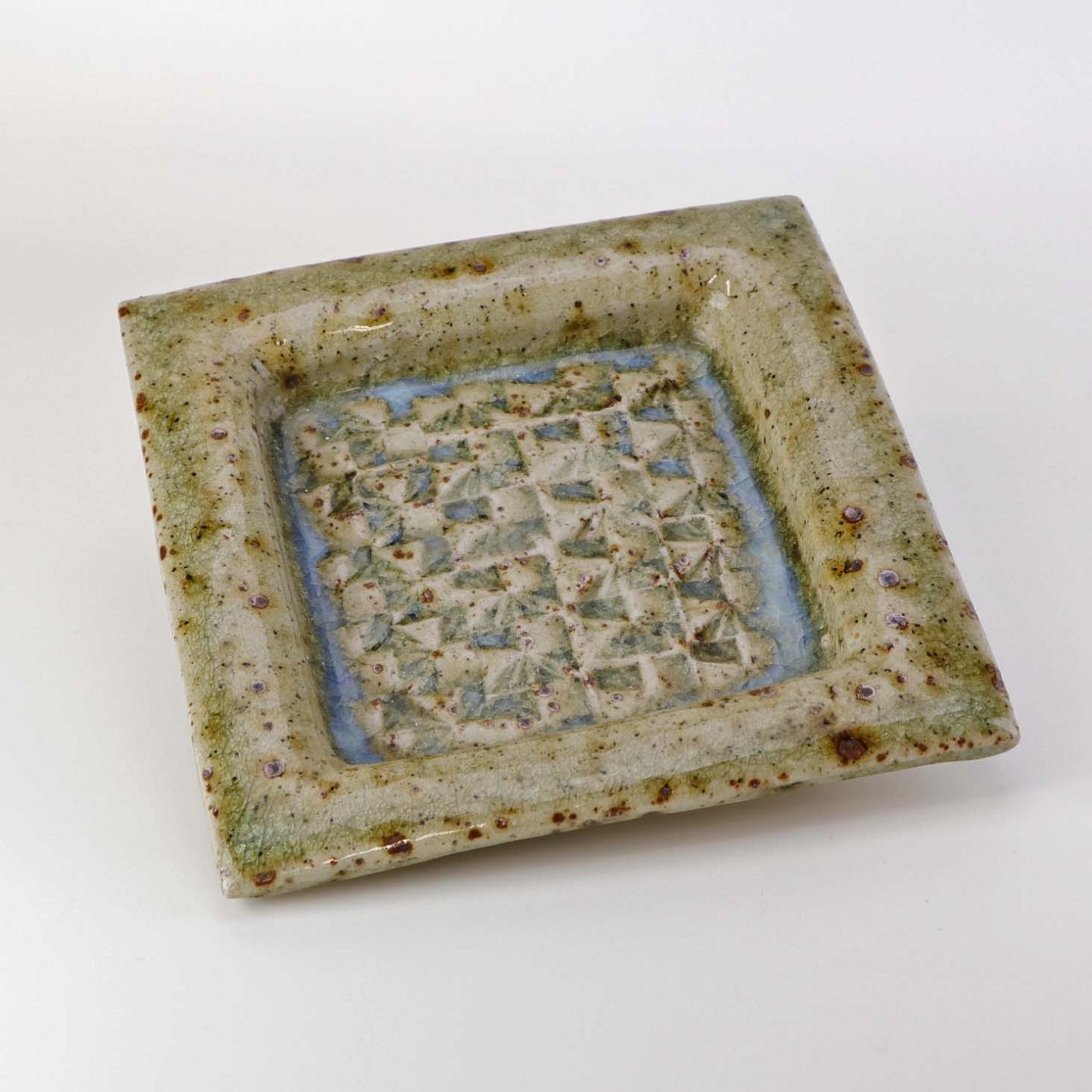 Firkantet fad i keramik med struktureret bund med lyseblå og beige glasur med røde pigmenter.