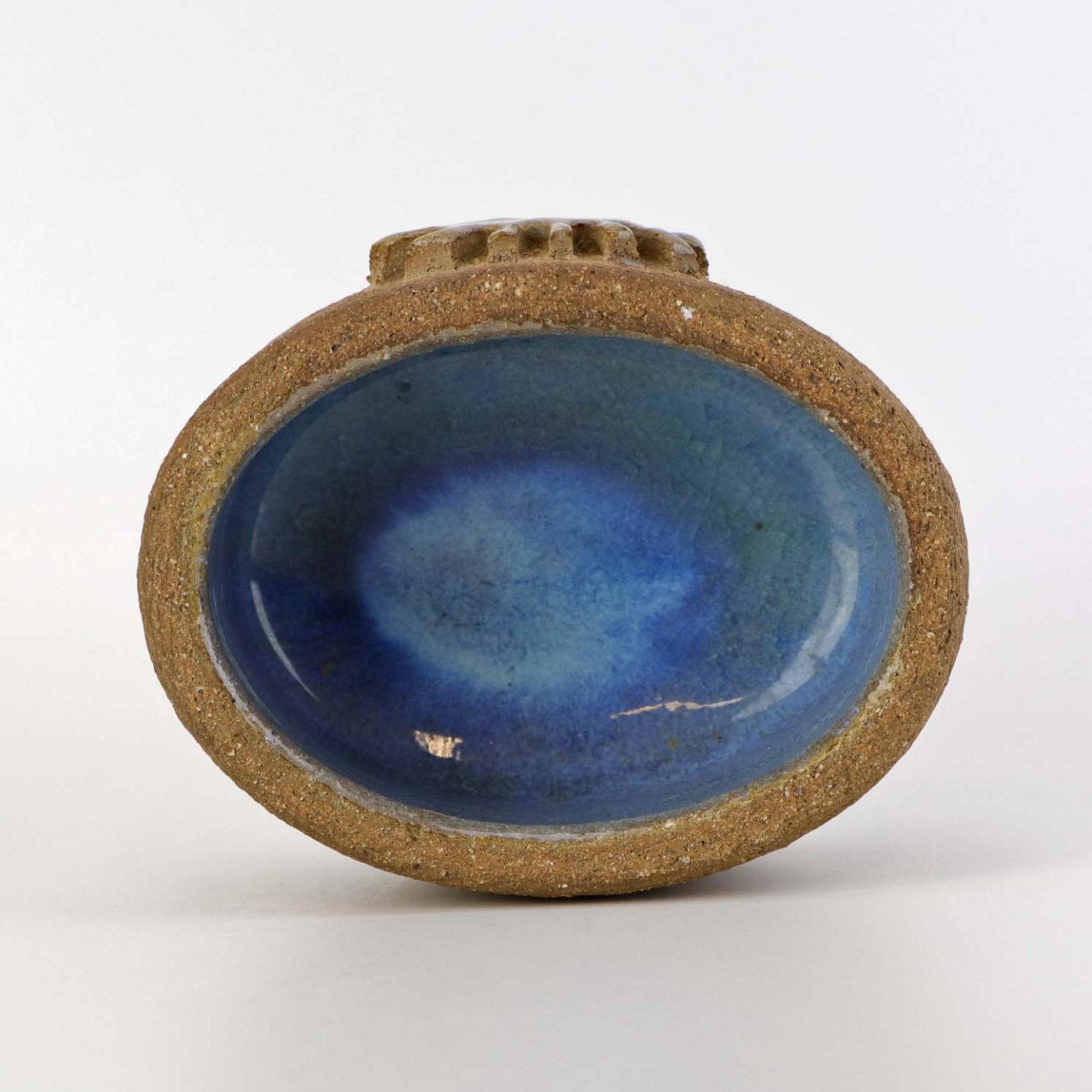 Lille oval skål i keramik med lysblå glasur på indersiden samt delvist glaseret sol mønster på ydersiden.