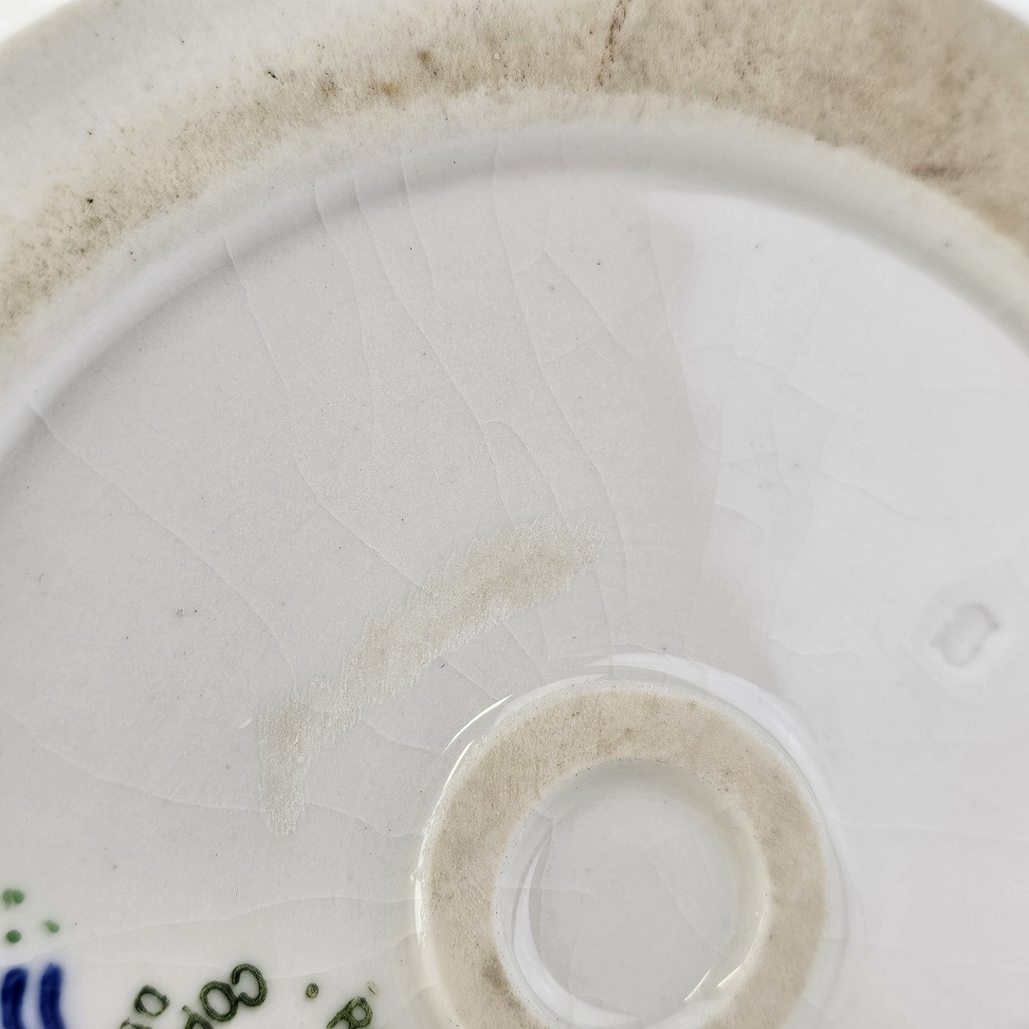 Fremstår med krakeleringer i overfladen og slid på mønsteret