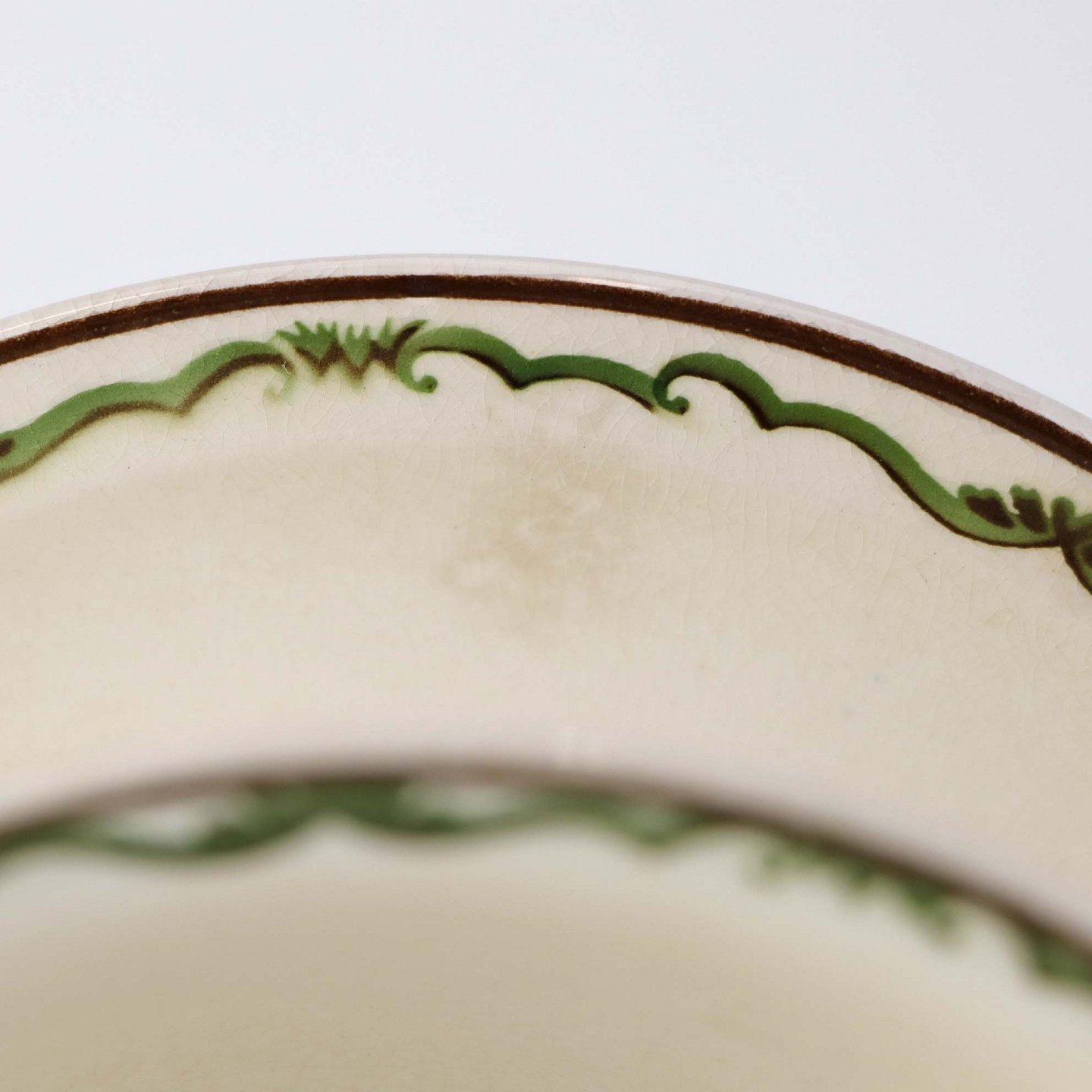 Fajancestel i stelform G med dekoration af orangegule blomster og grønne guirlander på lys baggrund med brun kant.