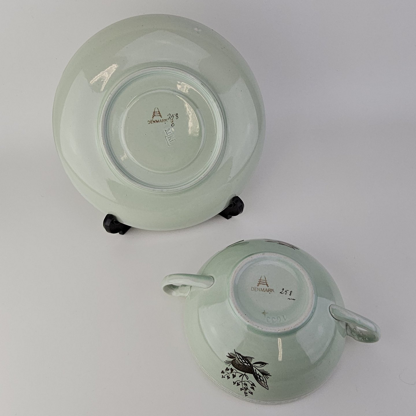 Stel i lysegrøn fajance med natur dekoration og flettet kant