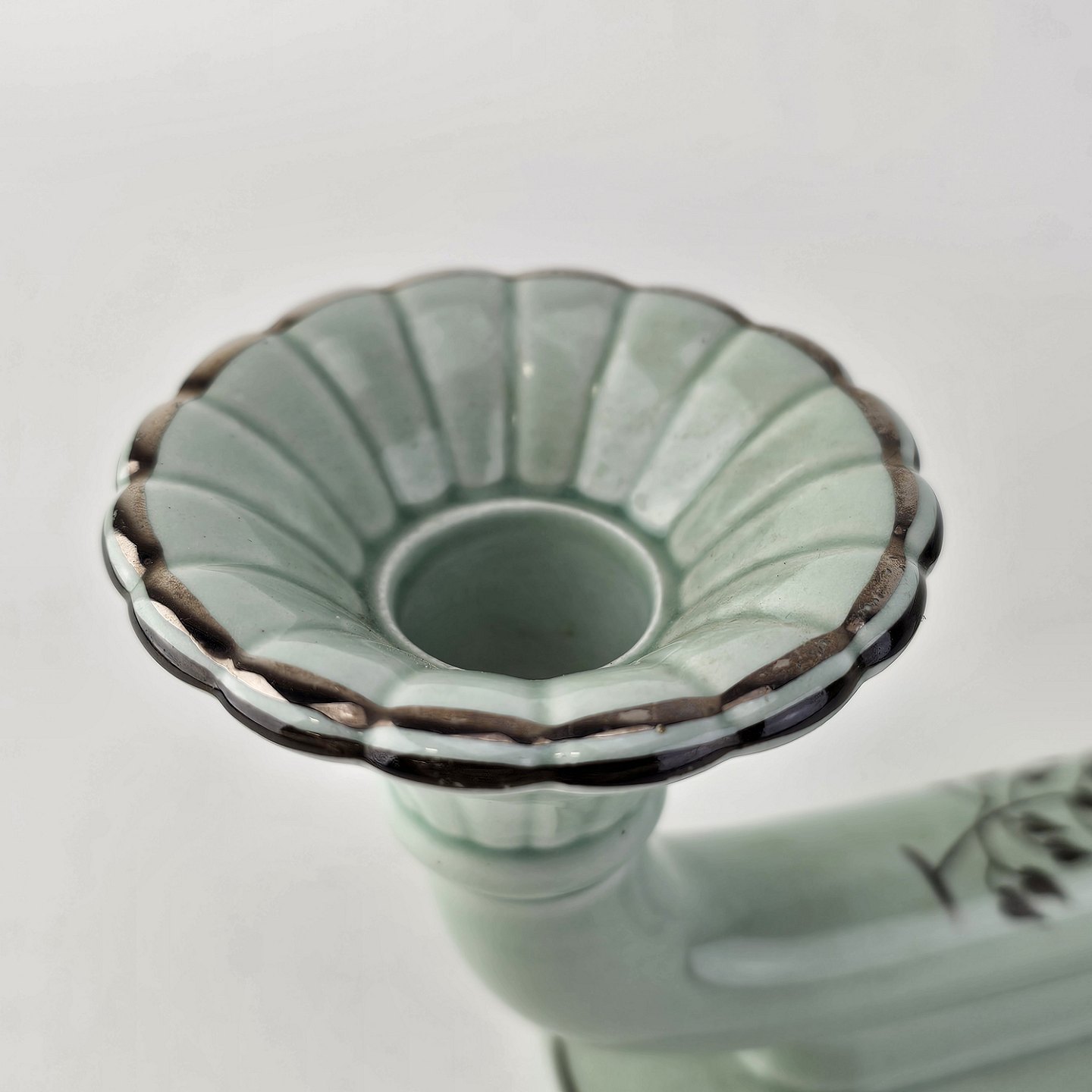 Stel i lysegrøn fajance med natur dekoration og flettet kant