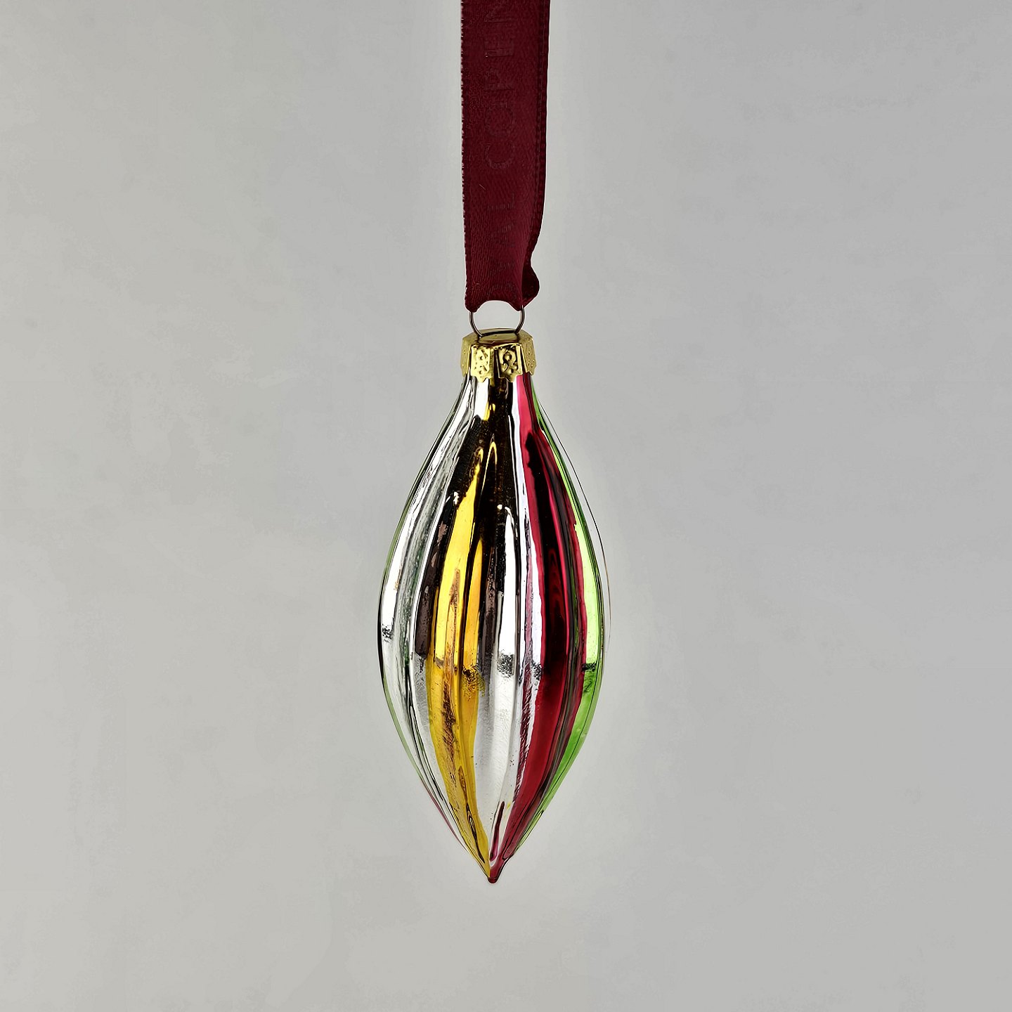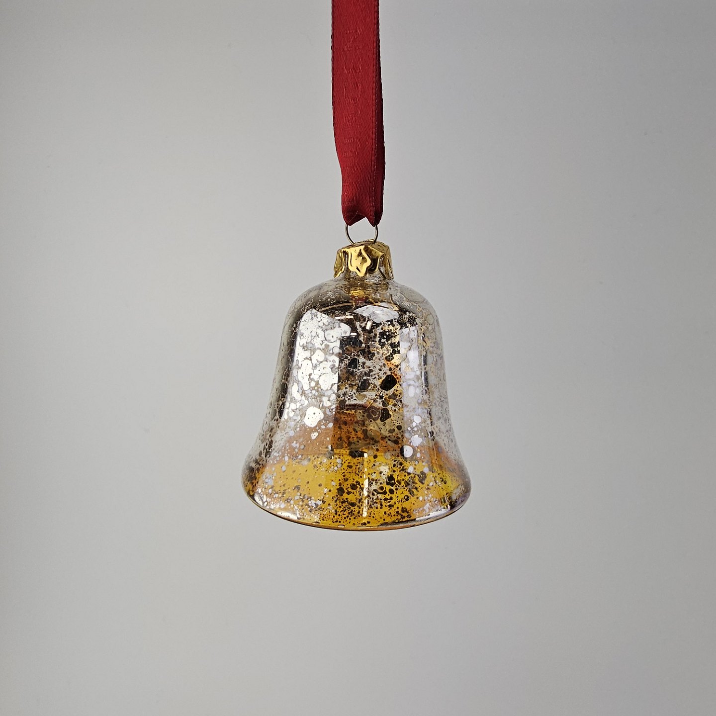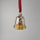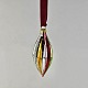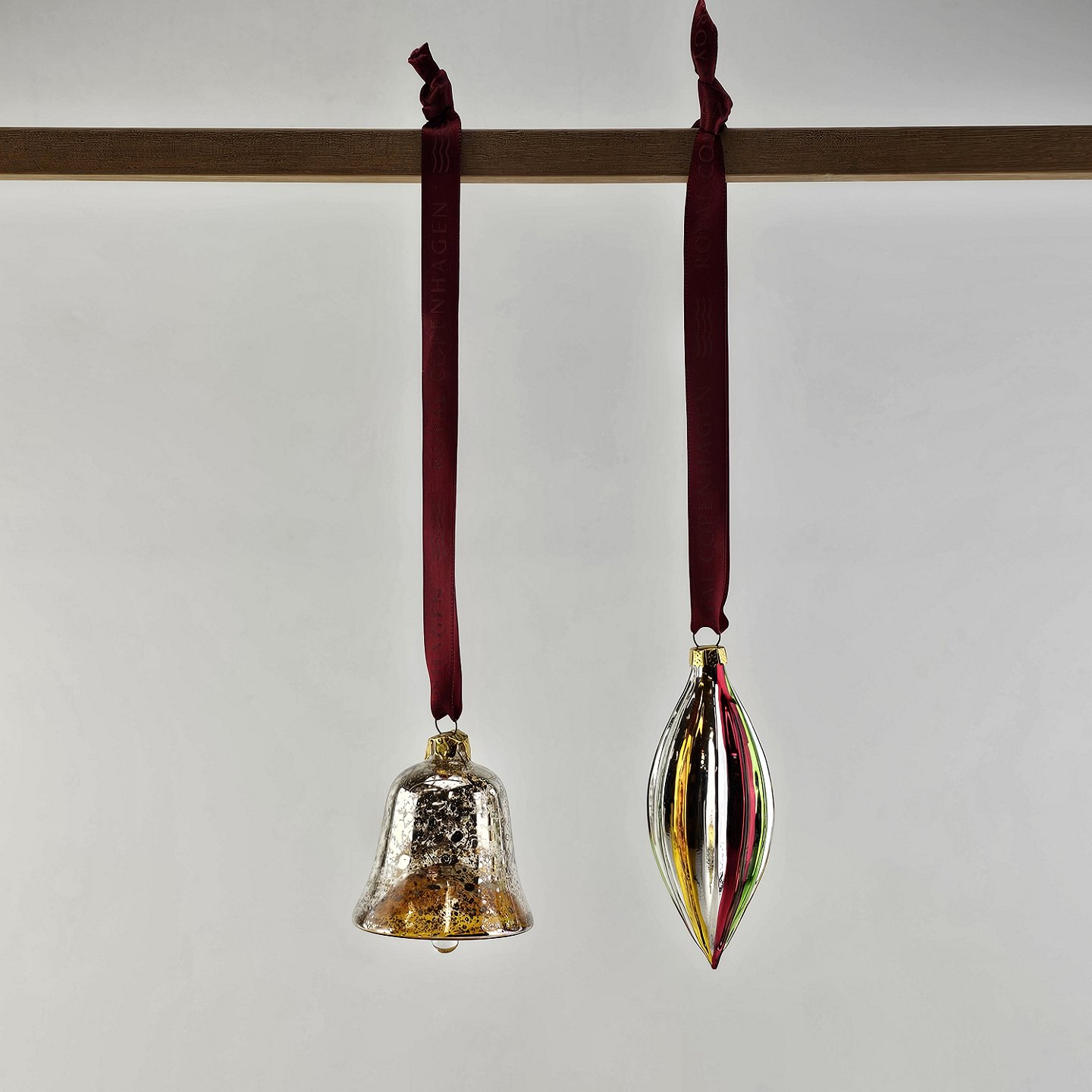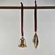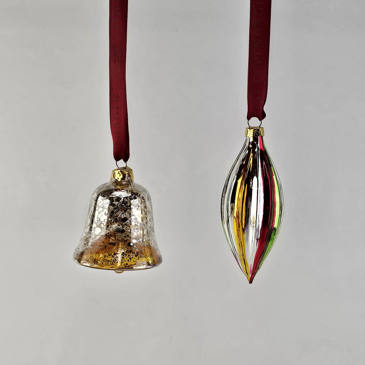 Juleornamenter i glas med motiv af en klokke og en aflang julekugle med rødt bånd til ophæng