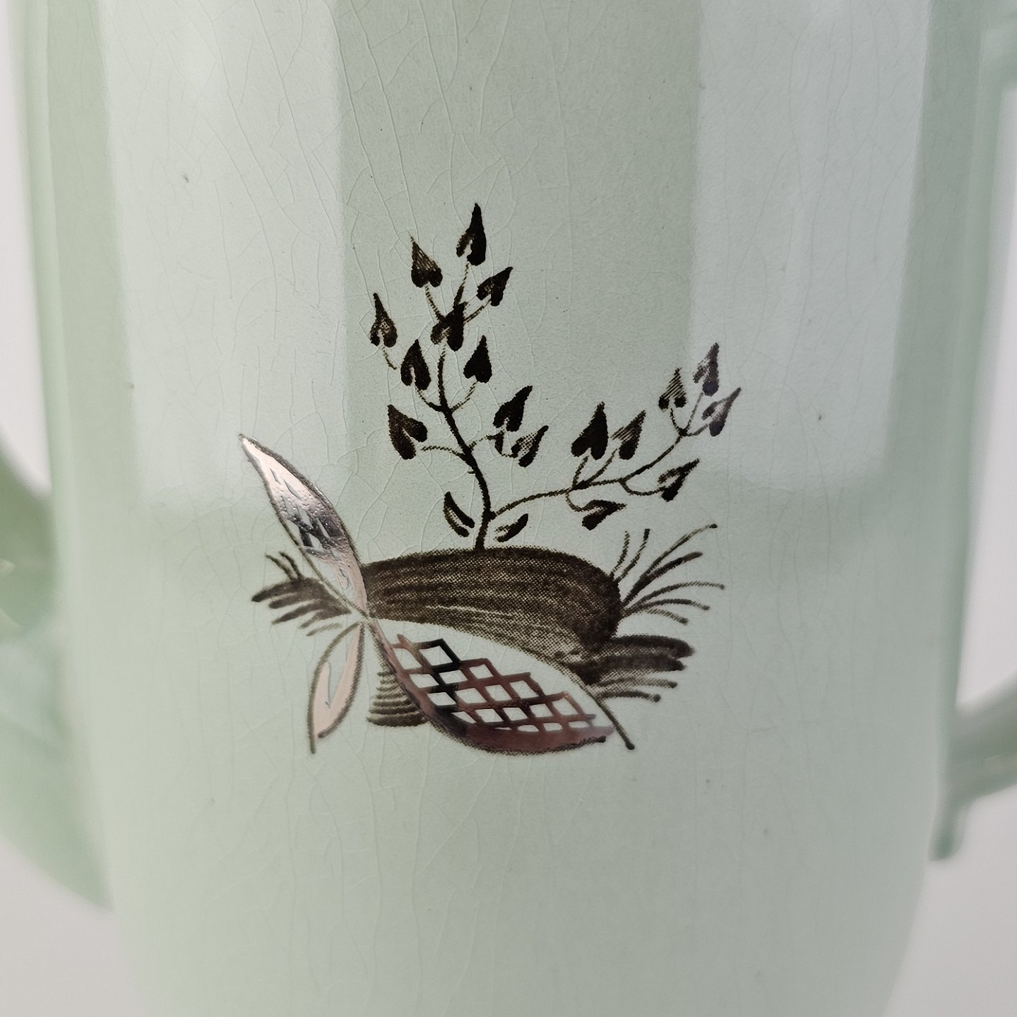 Stel i lysegrøn fajance med natur dekoration og flettet kant