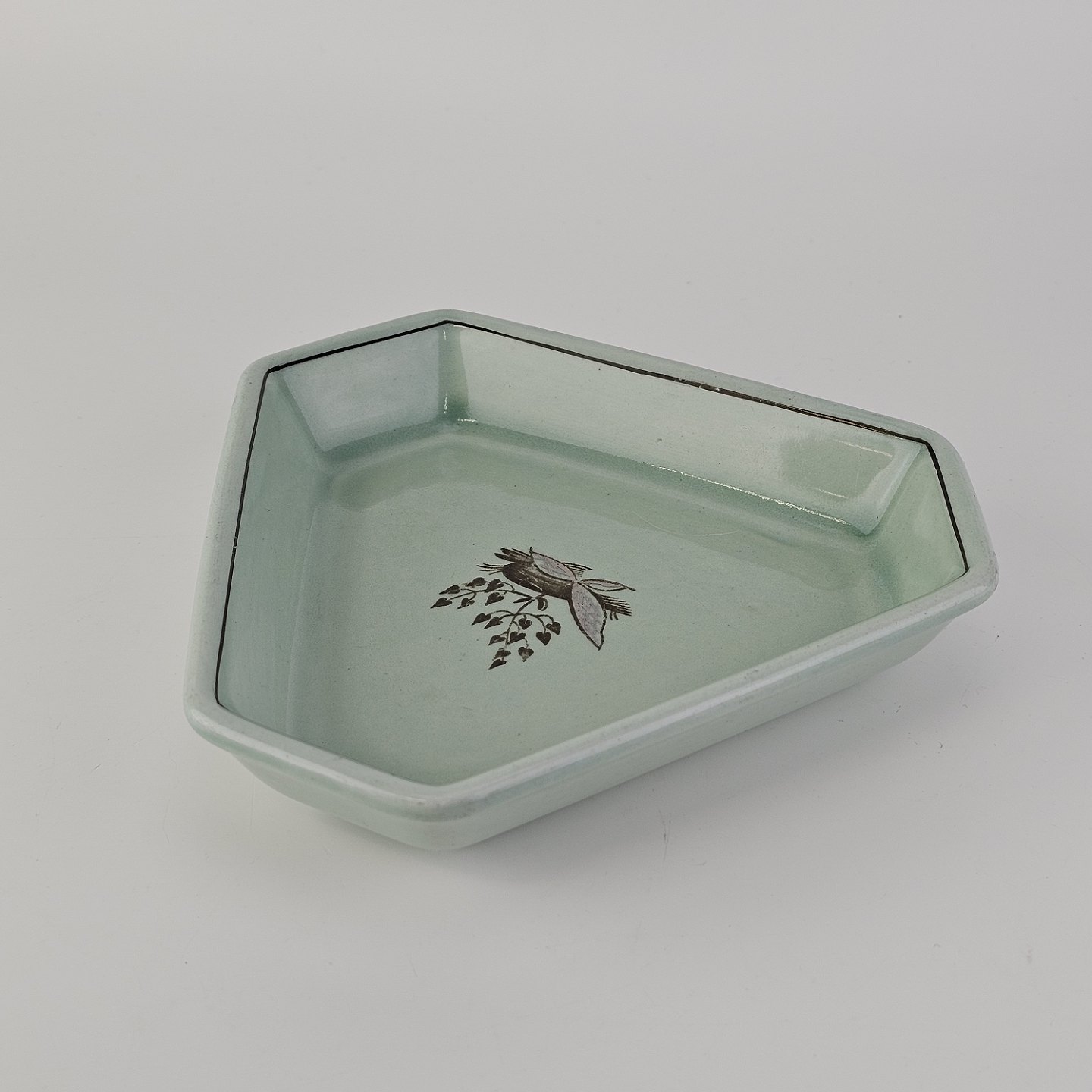 Stel i lysegrøn fajance med natur dekoration og flettet kant