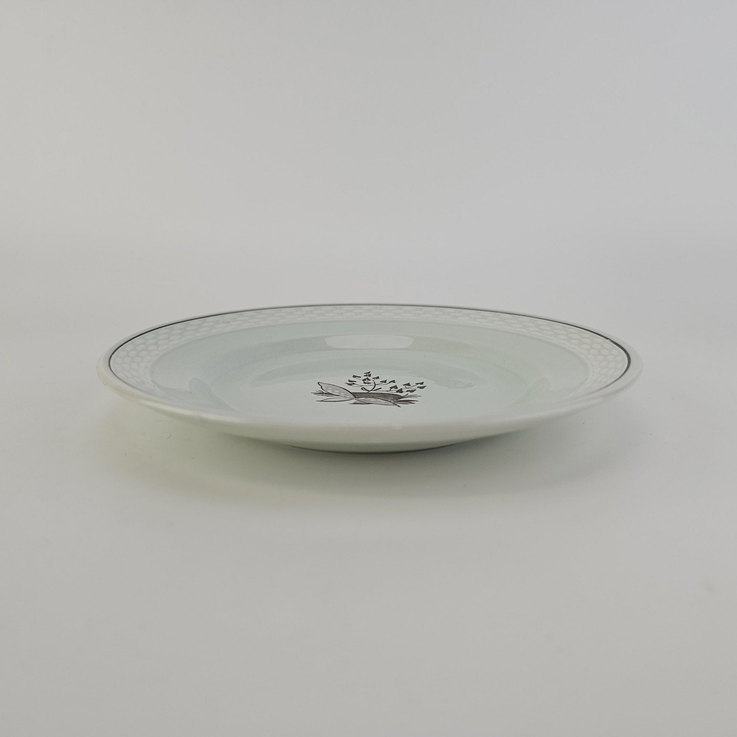 Stel i lysegrøn fajance med natur dekoration og flettet kant