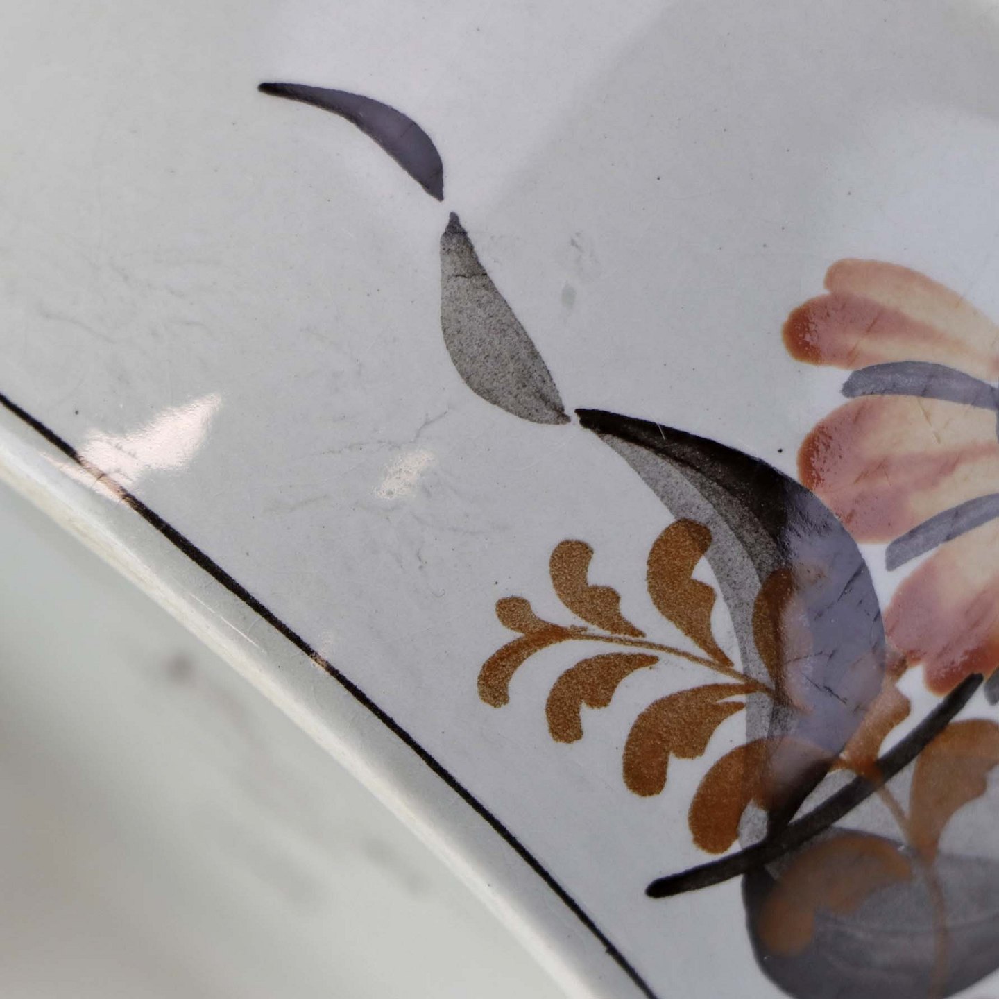 Fajancestellet er i stelformen Viktoria II med dekoration af orangebrune blomster på gråtonet baggrund med brun kant.