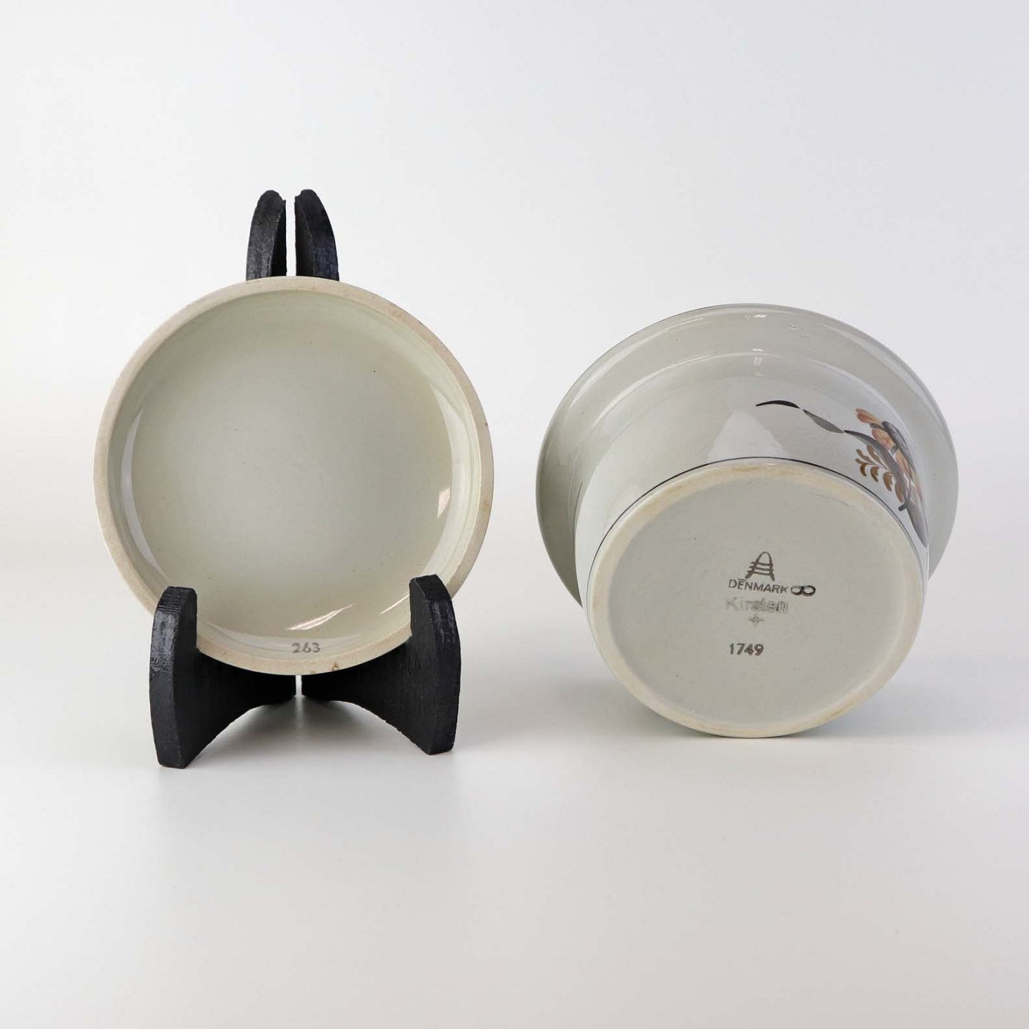 Smørskål med låg i fajance fra stellet Kirsten, som blev fremstillet i perioden 1934-1957. Nr. 1749