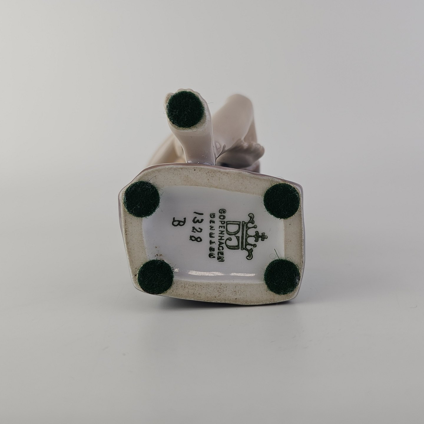 Figur i hvidt porcelæn med motiv af en dreng med navnet Ole i en stribet kasket, som sidder på sten