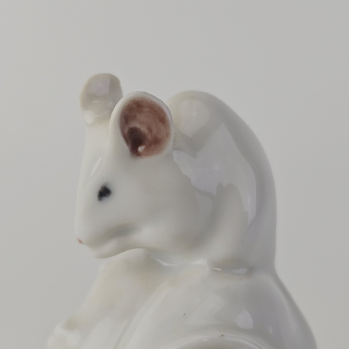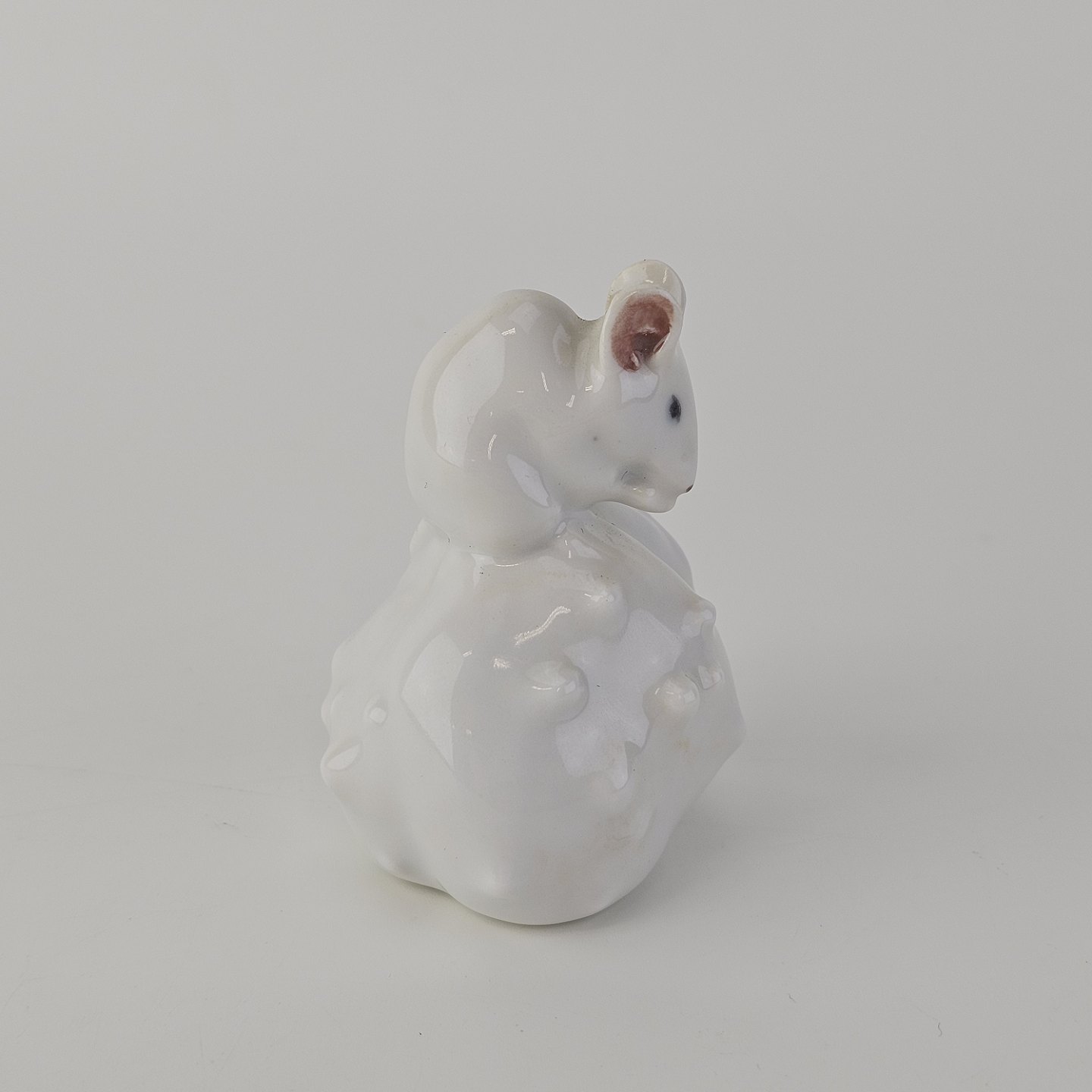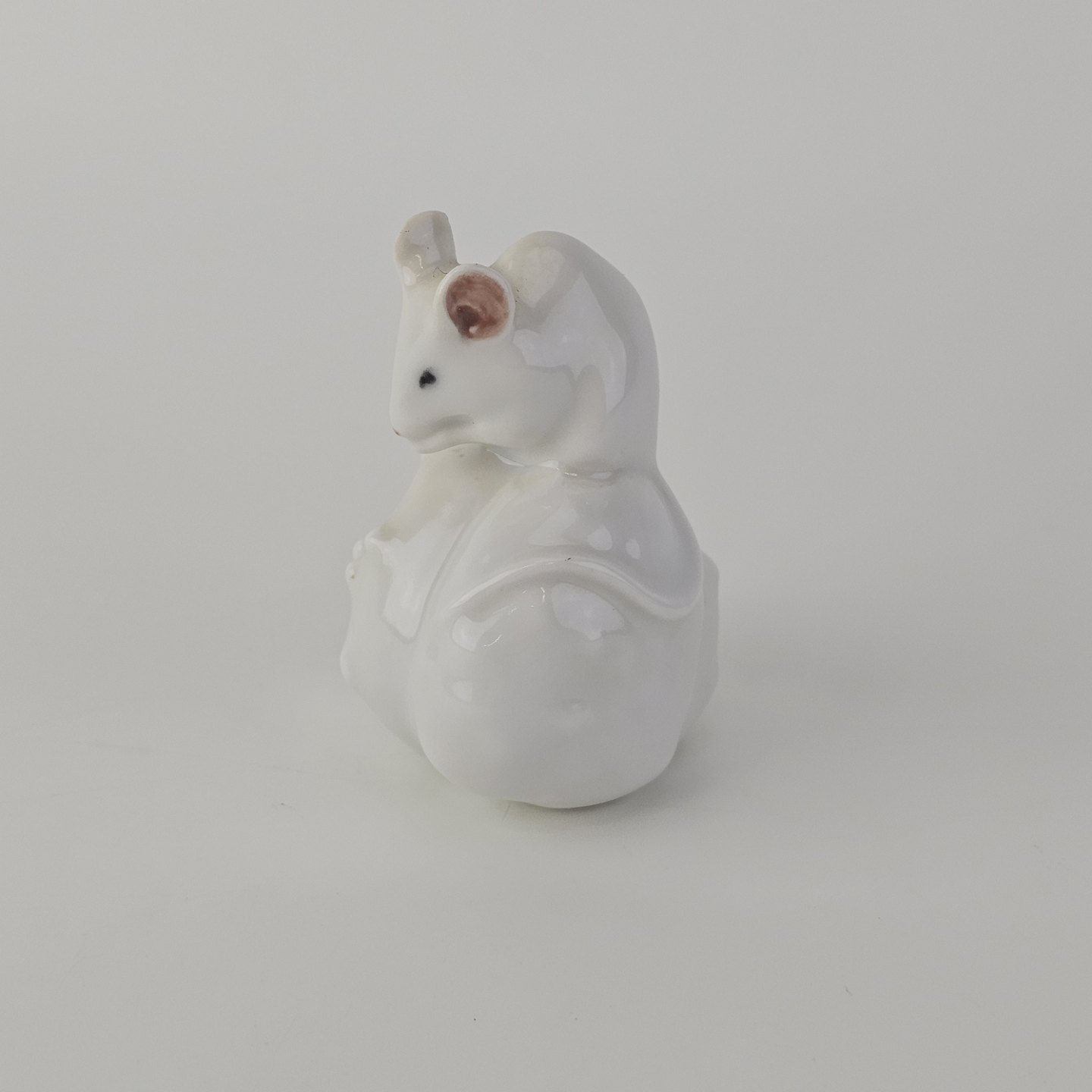 Figur i kongeligt porcelæn med motiv af en hvid mus siddende på en kastanje