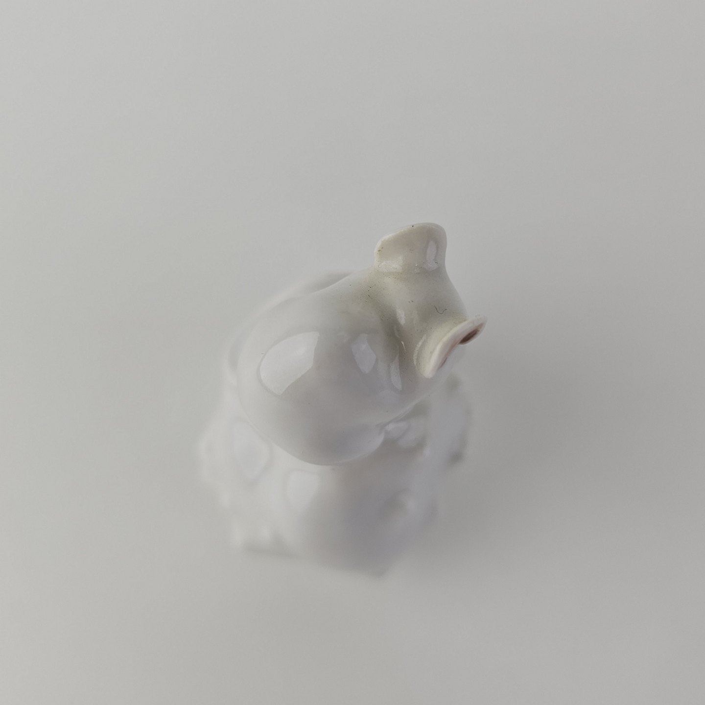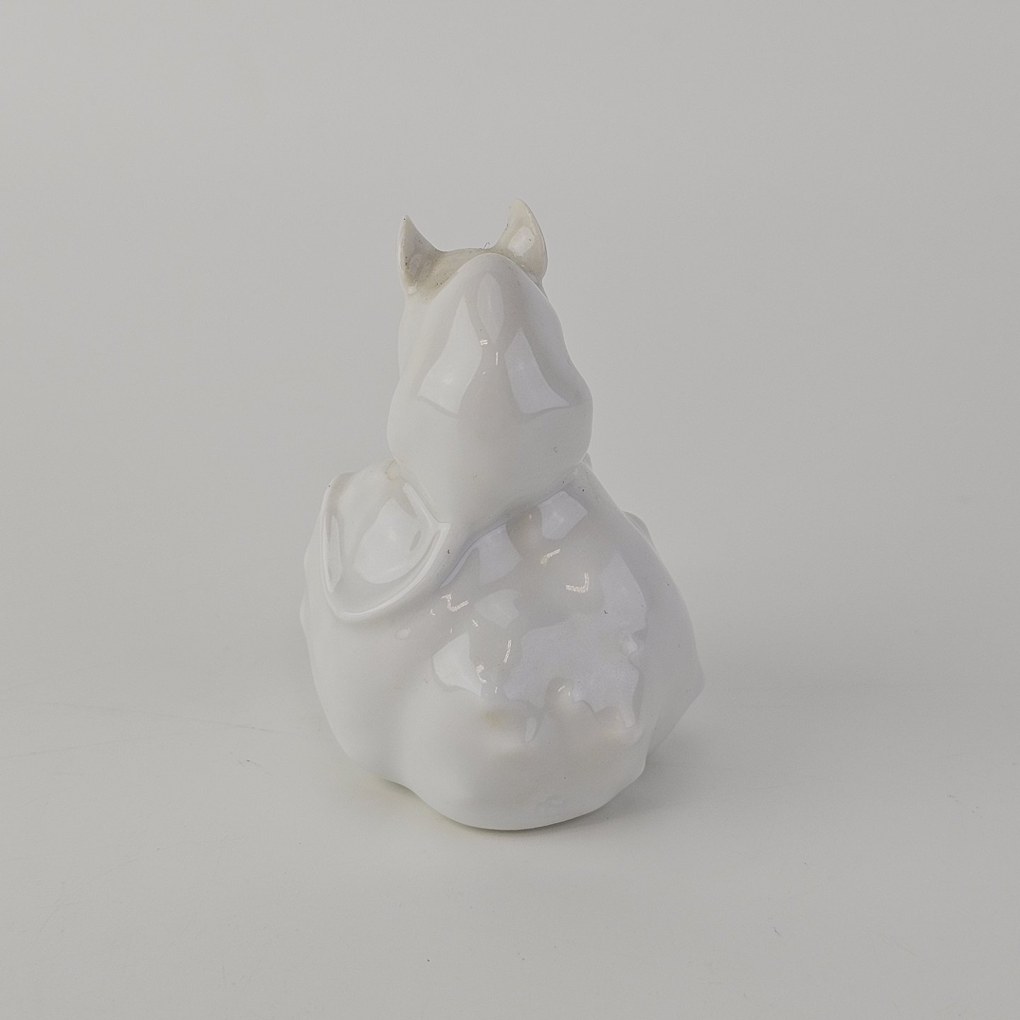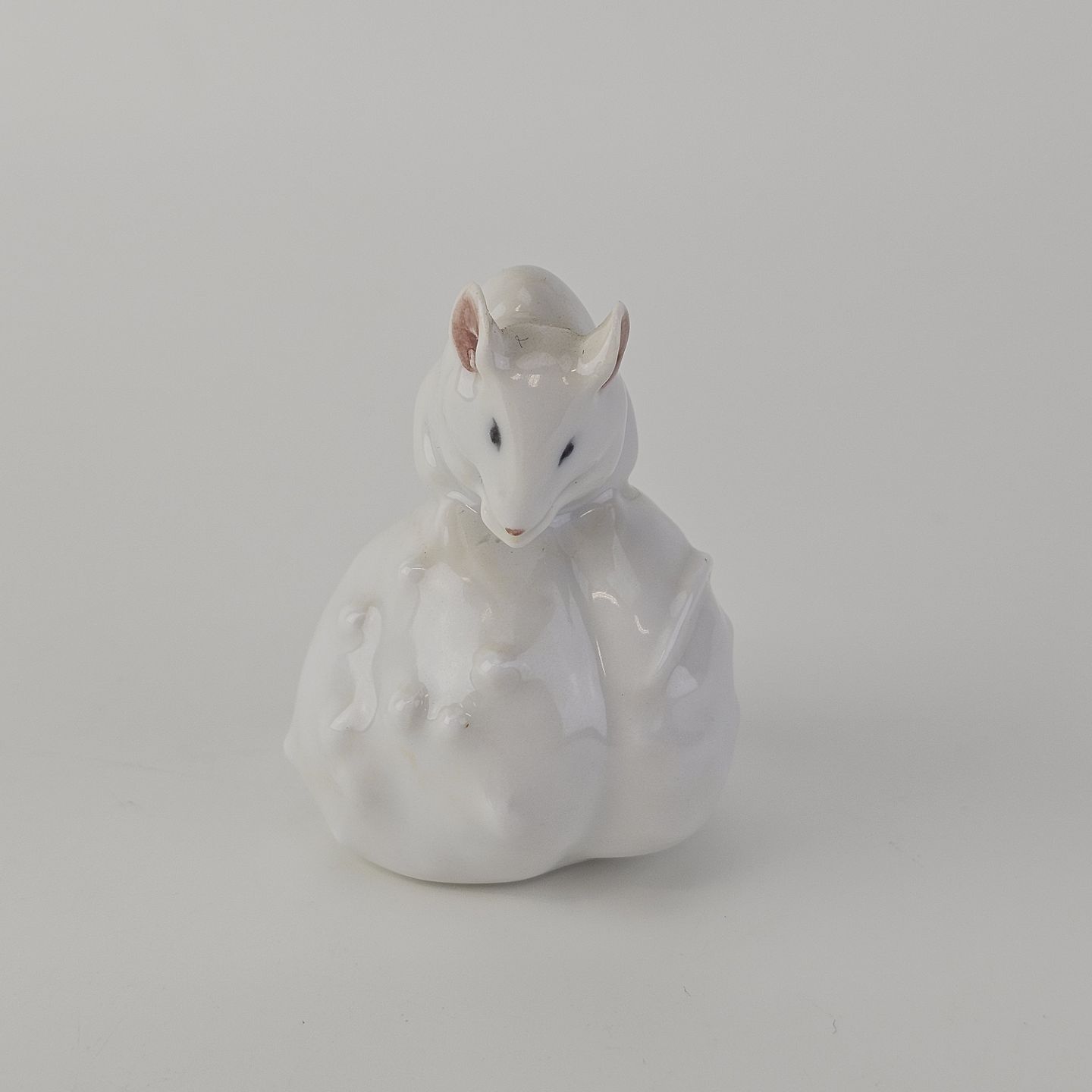 Figur i kongeligt porcelæn med motiv af en hvid mus siddende på en kastanje