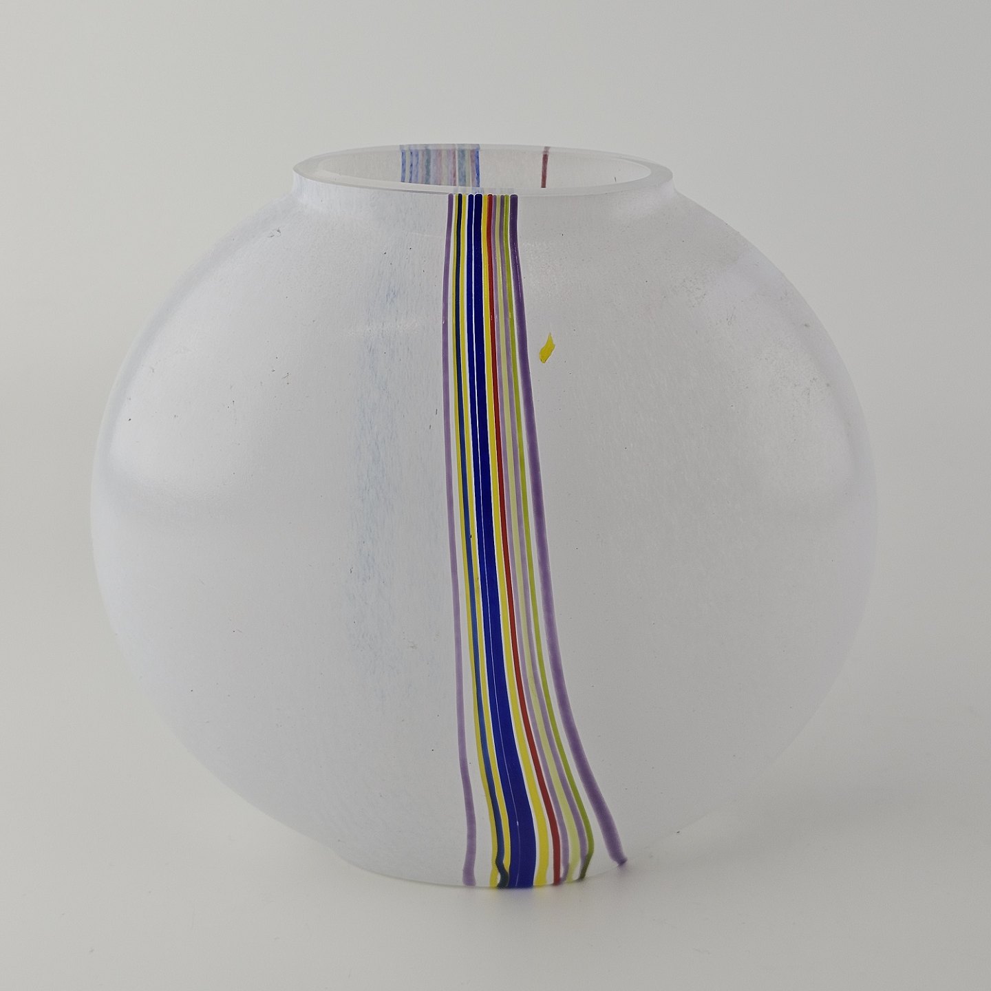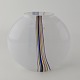 Rund vase i glas med dekoration af linjer og streger i flere farver