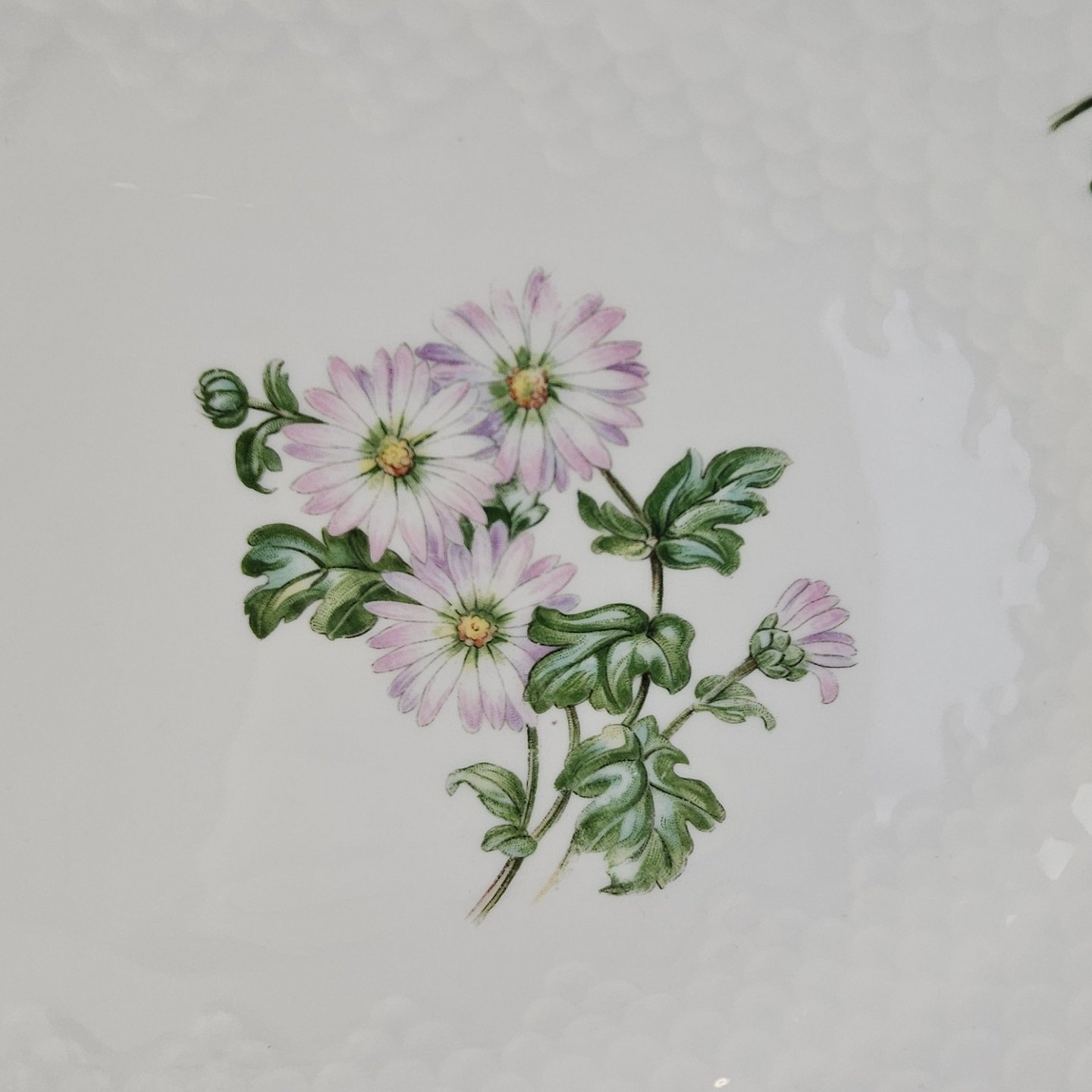 Krysantemum er hvidt porcelæn dekoreret med lys lilla blomst, grønne blade og guldkant.