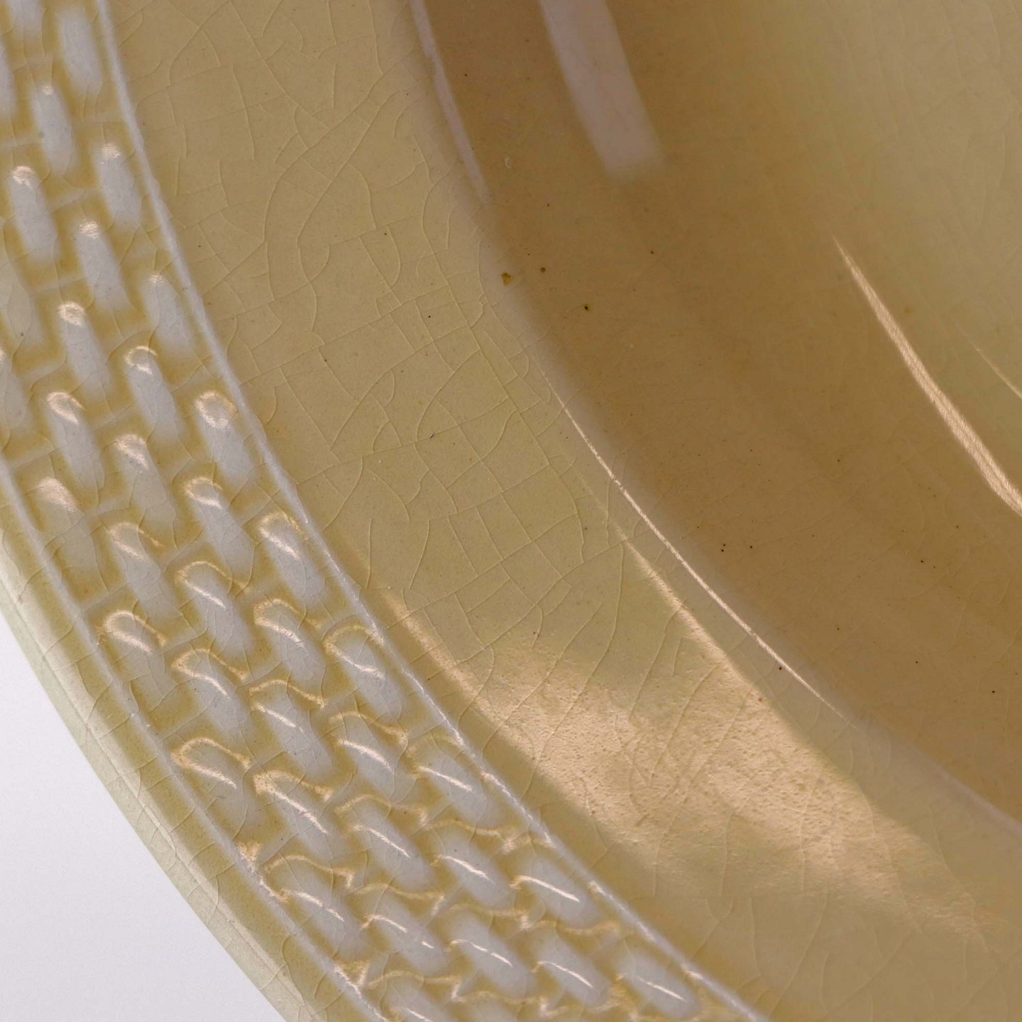 Sandfarvet fajancestel i stelform Viktoria II - Fletværk med dekoration af hvidt flet på gullig baggrund.