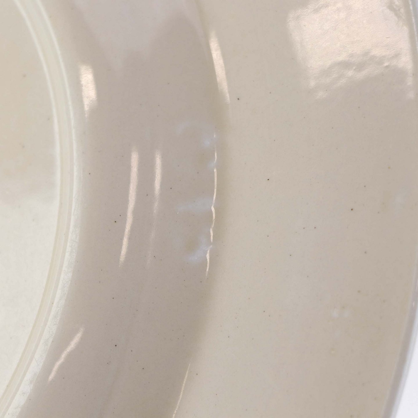Fremstår med nister, ujævnheder i glasuren og i glasurfarven på bagsiden.