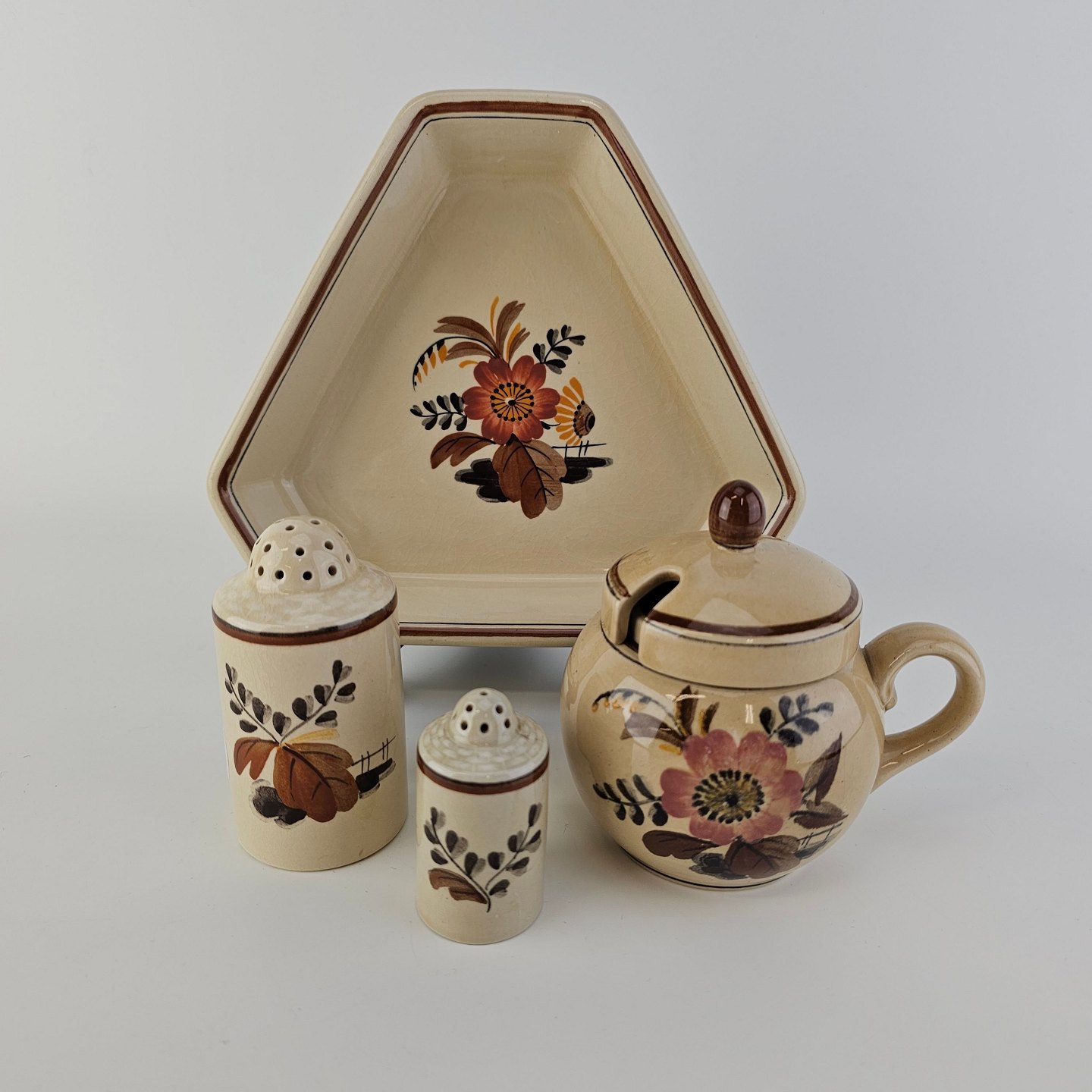 Plat de menage med peberbøsse, saltbøsse og sennepskrukke i fajance fra stellet Knud