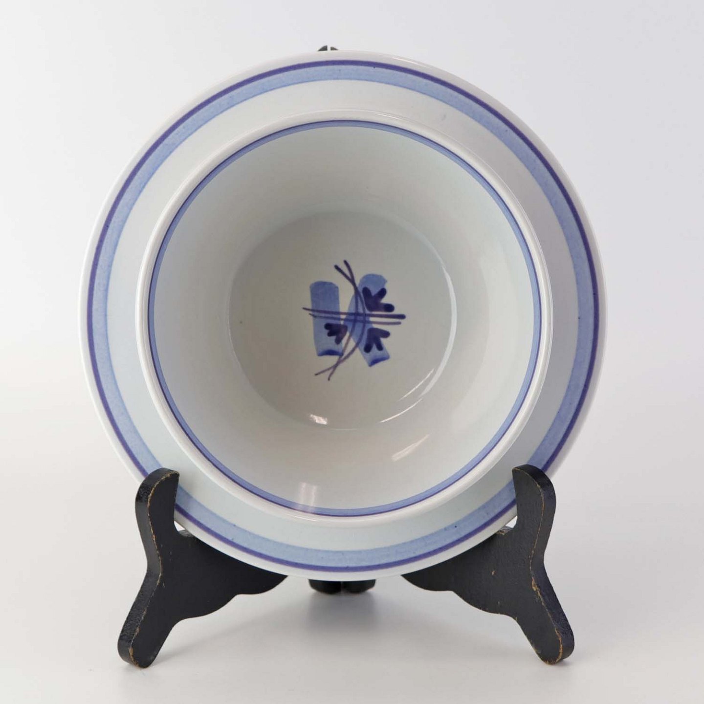 Fajancestel i stelform CA med dekoration af abstrakt motiv i blå og lyseblå på en råhvid baggrund.