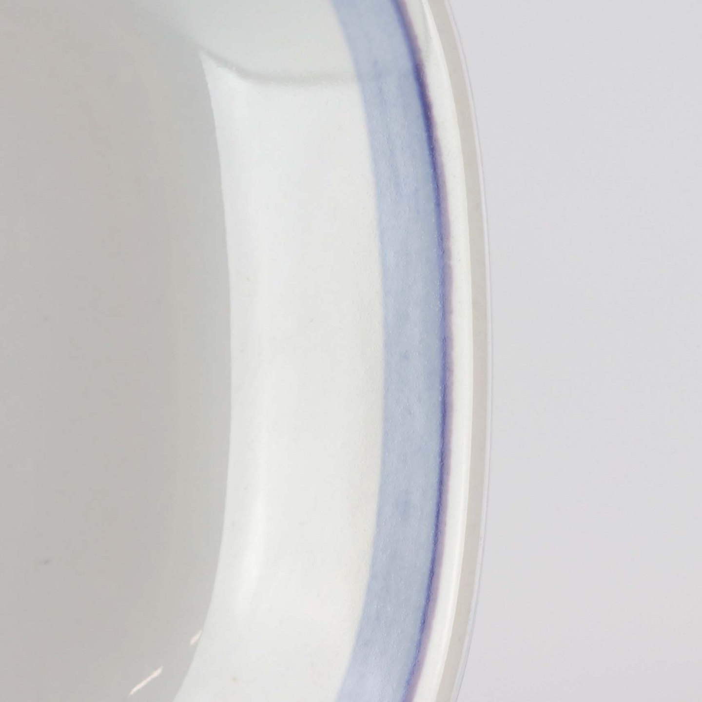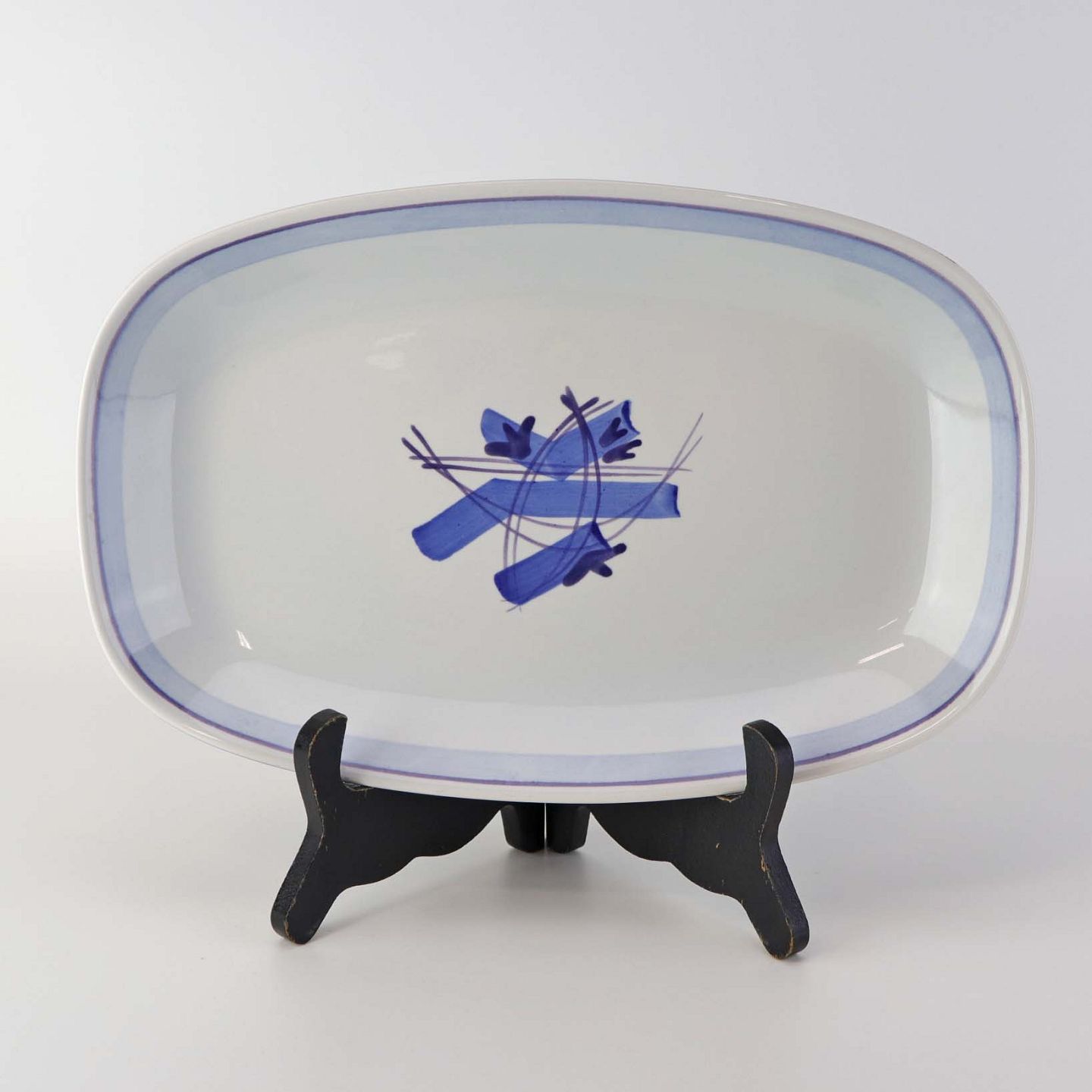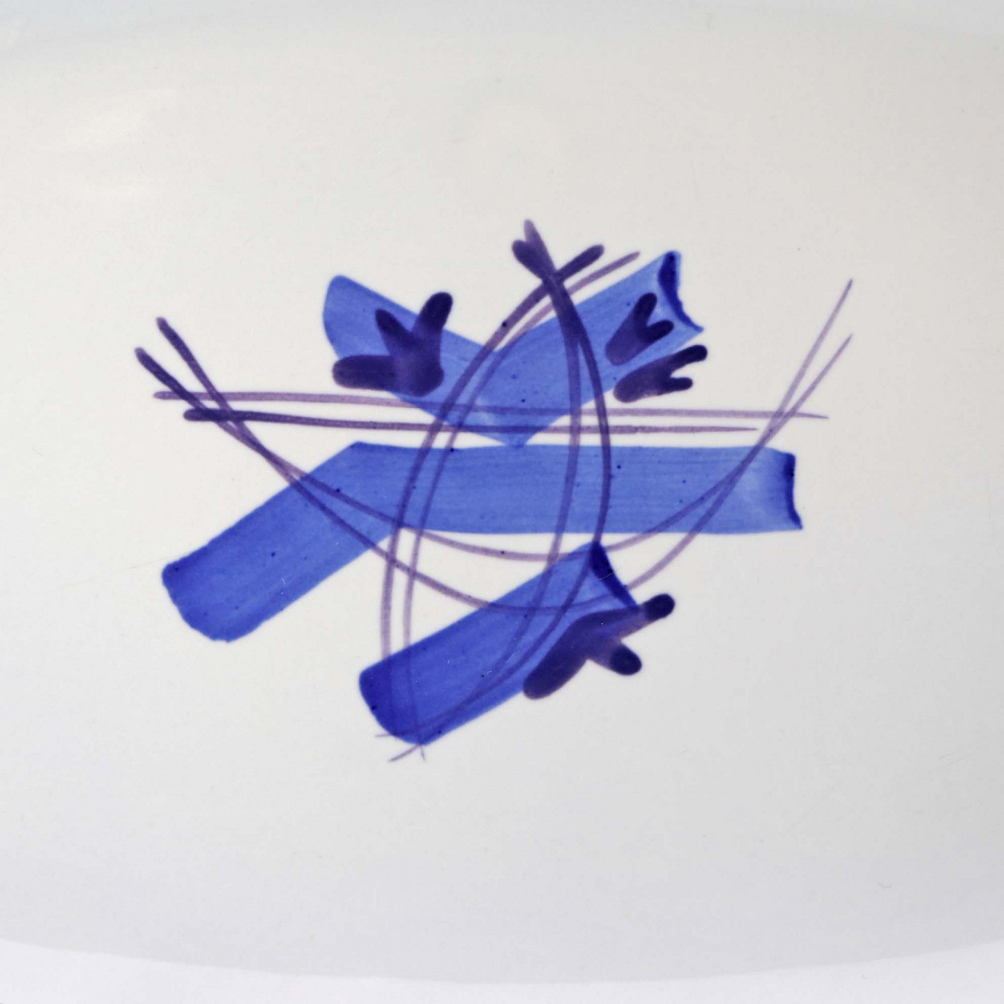 Fajancestel i stelform CA med dekoration af abstrakt motiv i blå og lyseblå på en råhvid baggrund.