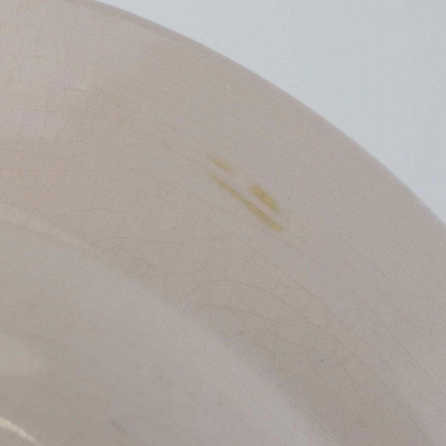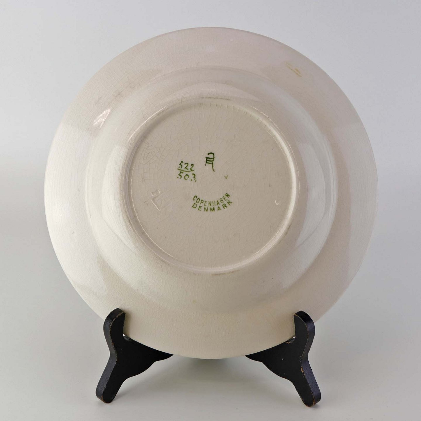 Fremstår med krakkeleringer i glasuren, brugsspor på dekorationen og under bund.