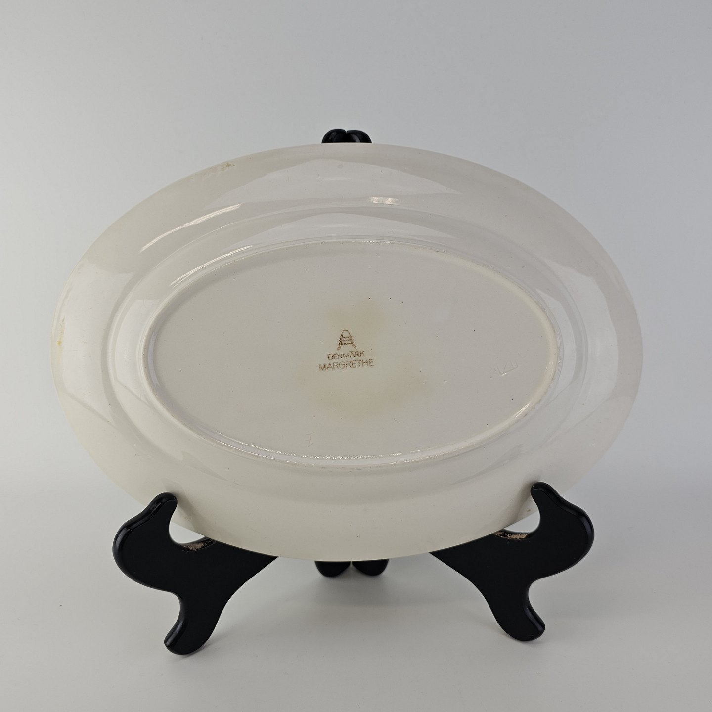 Ovalt fad i fajance fra stellet Margrethe fremstillet i perioden 1937-1940.