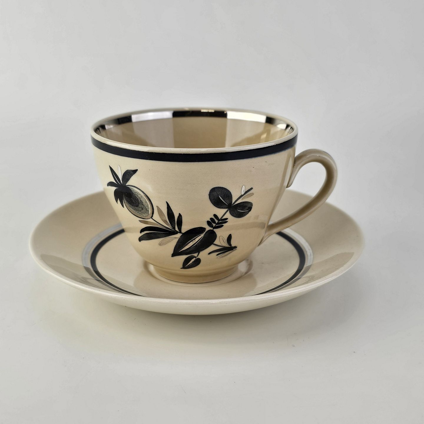 Råhvidt fajancestel i stelform E med dekoration af naturmotiver i sølv og sort farve.