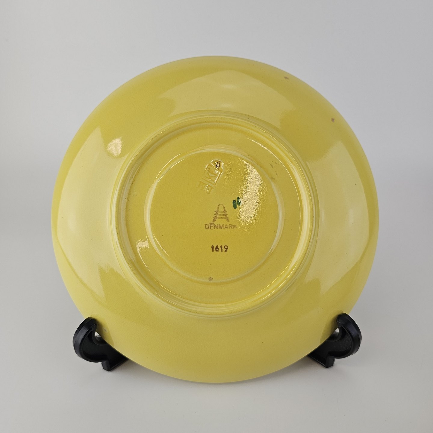 Fajancestel i stelform C med dekoration i gule nuancer med grøn stribe.
