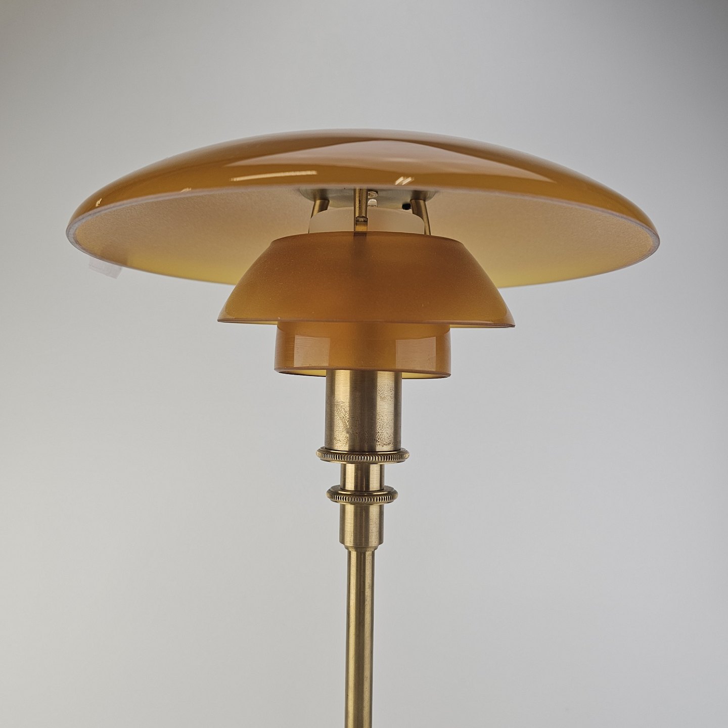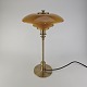 Bordlampe PH 3/2 med skærm af mundblæst ravfarvet etlagsglas og fod af strøgslebet messing