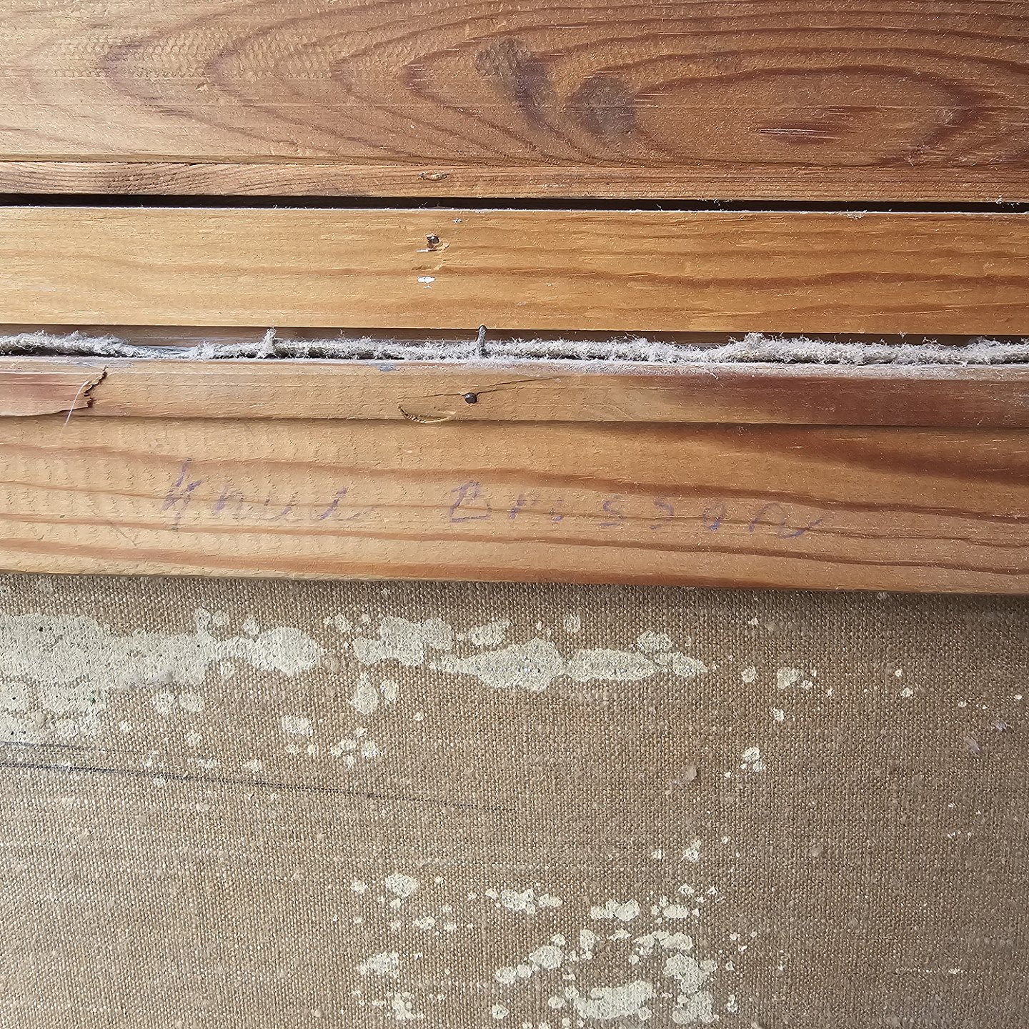 Oliemaleri på lærred med titlen Tisvilde Hegn. Monteret i sortmalet ramme med abstrakt naturmotiv, dateret 1960