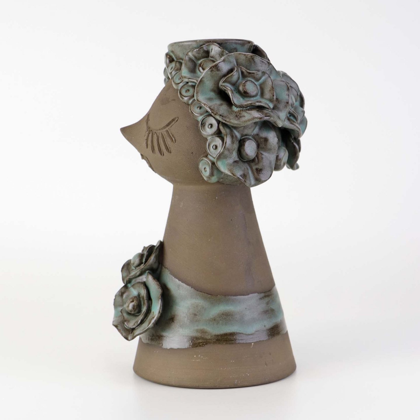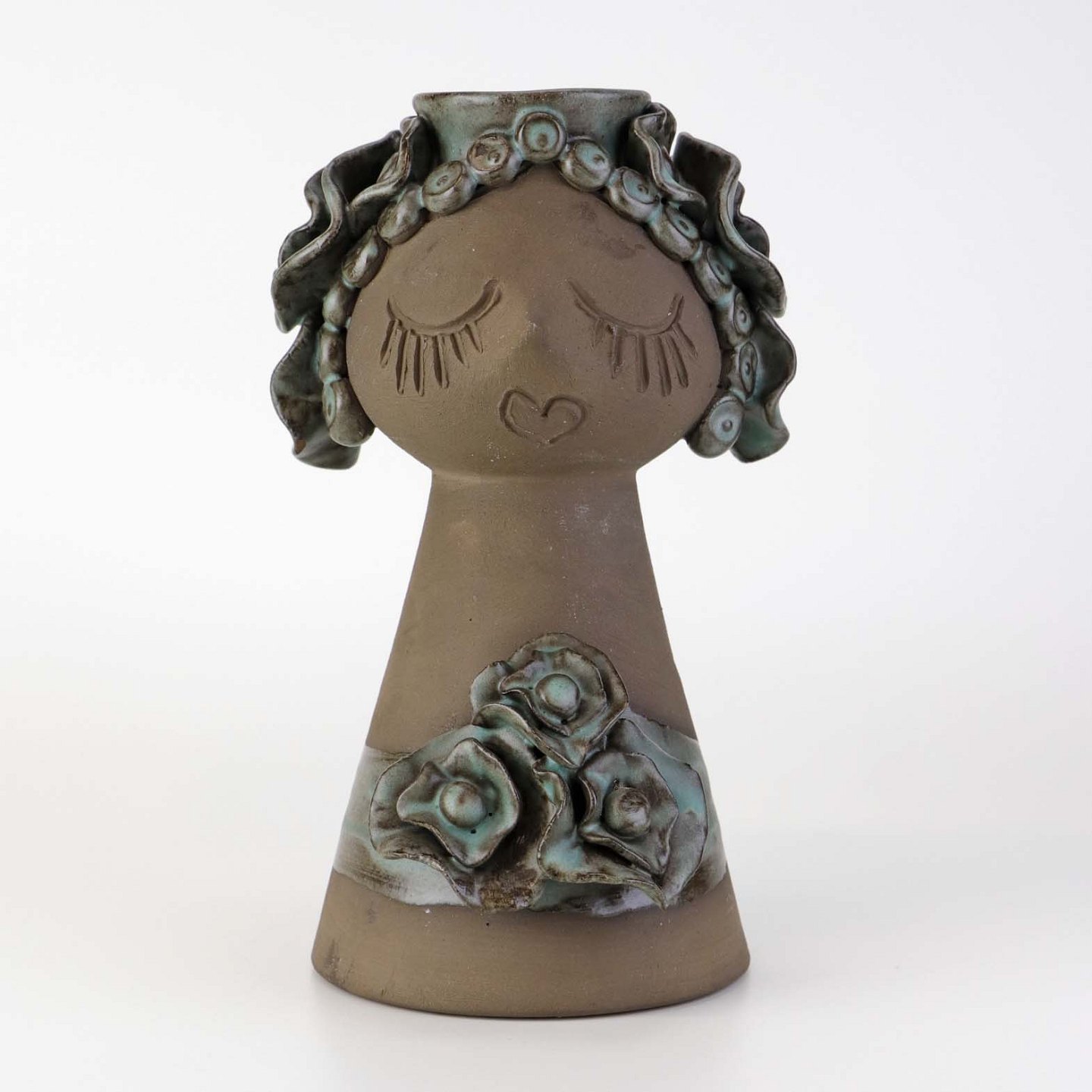 Vase i delvist glaseret keramik med motiv af Thurøpige med grønlig glasur.