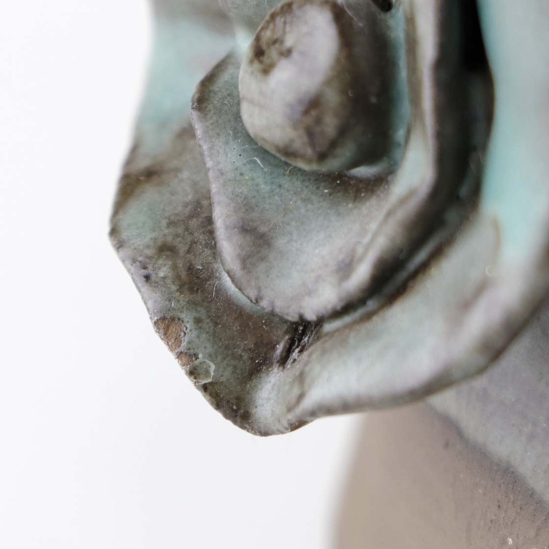 Fremstår med brugsspor på uglaseret keramik samt mindre nøk ved en blomst.