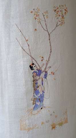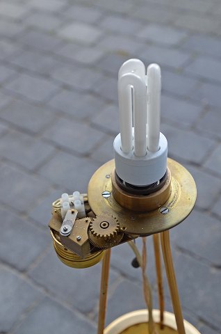 Kinesisk gulvlampe fremstillet i vandbøffelhorn med fatningshus i messing. Lampen har monteret et drejehjul ved fatningshuset; når lampen er tændt drejer lampeskærmen rundt. Lampeskærmen er i lyst stof broderet med kinesiske motiver.