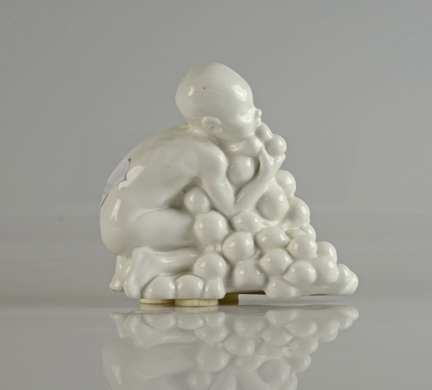 Figur i hvid porcelæn med motiv af dreng med druer