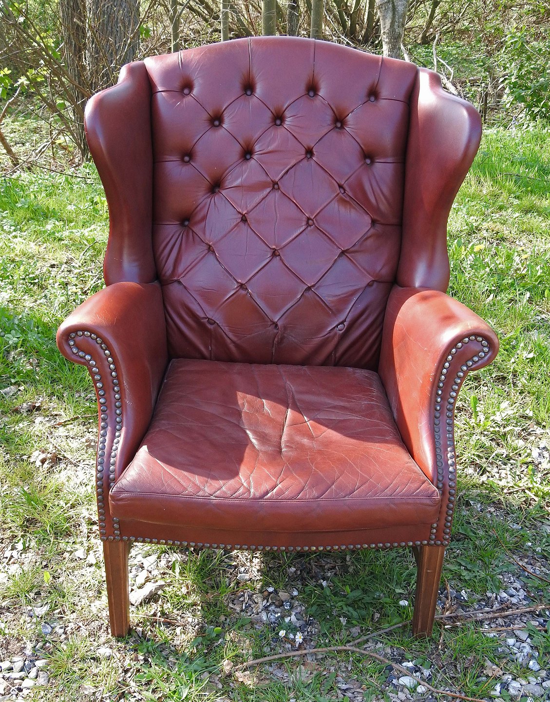 Øreklapstol, lænestol, højrygget stol, læderstol, chesterfieldstol, brun læder stol, herrestol, armstol