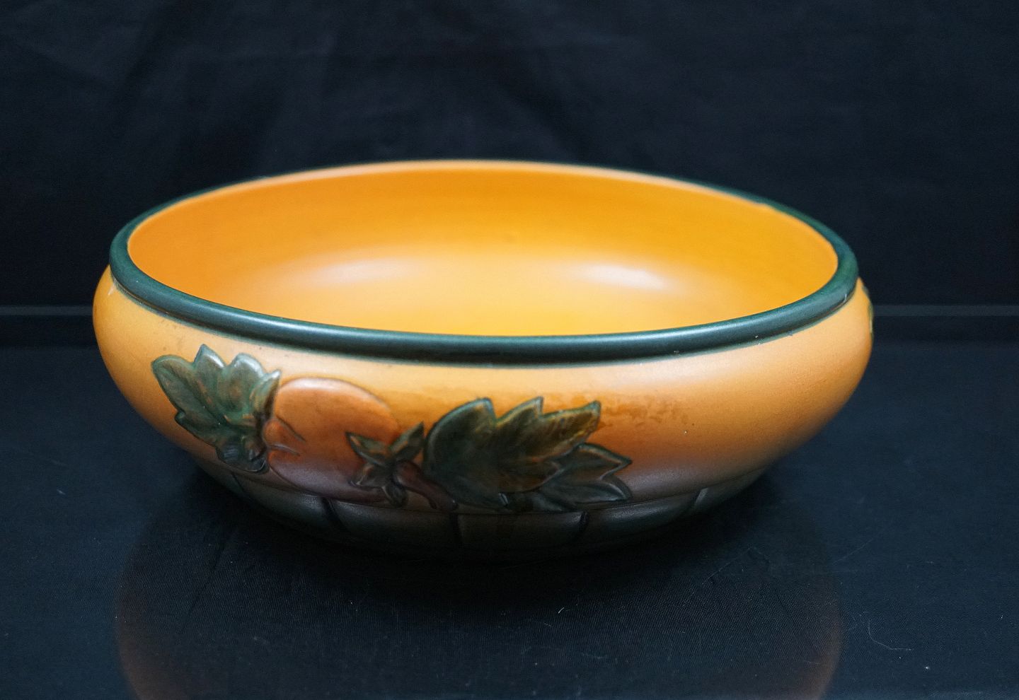 P Ipsens Enke, frugtskål nr. 146 i terracottafarve, dekoreret med frugter, skålen er Art Deco-stil