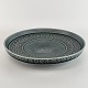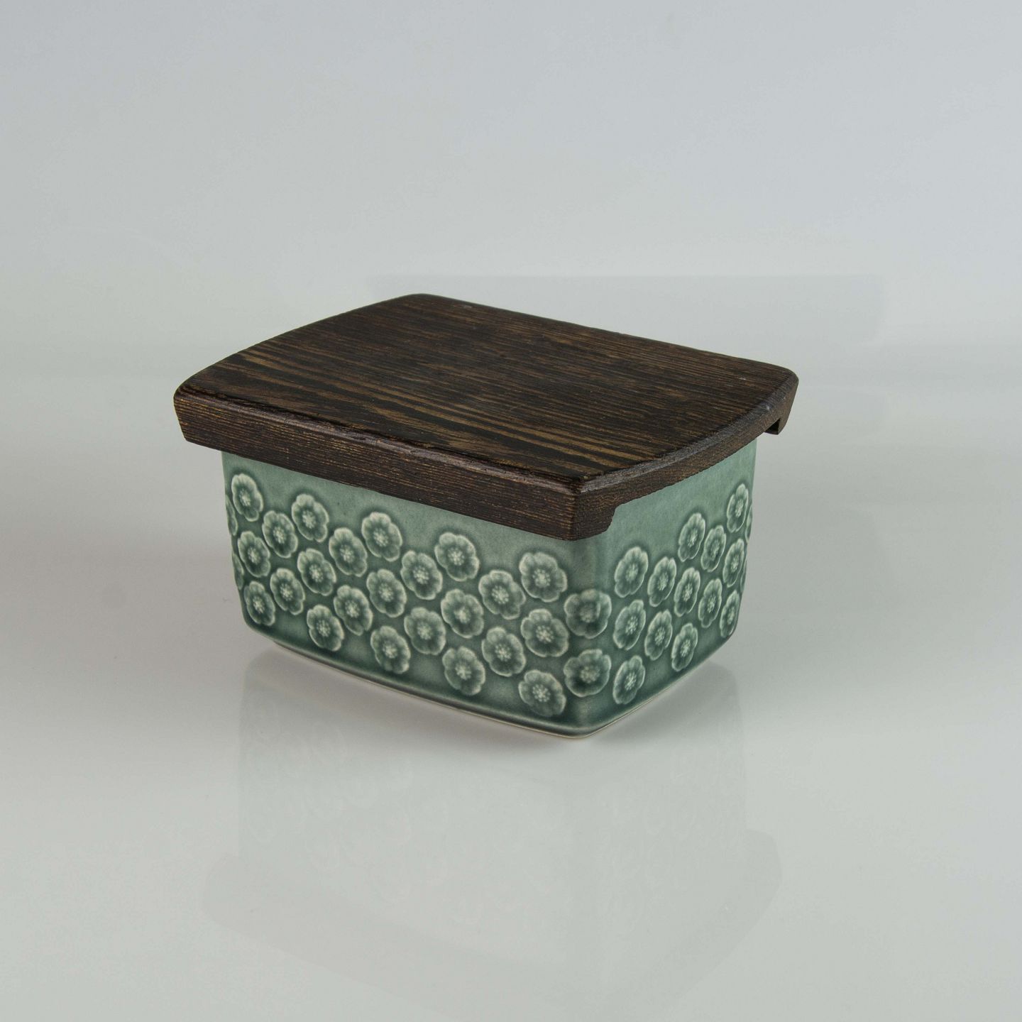Skål i blågrøn stentøj med blomster motiver og låg i træ.