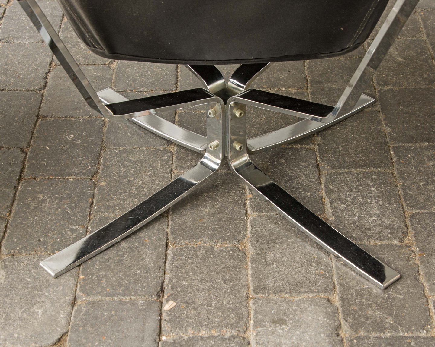 Et sæt højrygget lænestole med skammel i forkromet stål og rødt læder model Falcon.