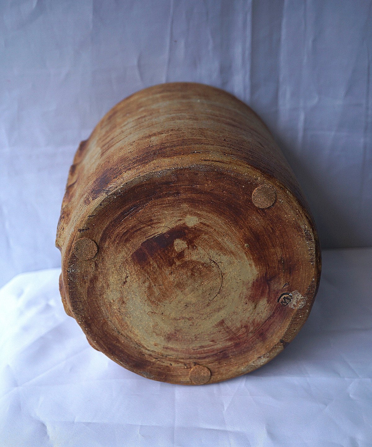 Lertøjskrukke med blå "dutter" på front. Krukkens øverste kant er bukket ind, så den også kan bruges som vase