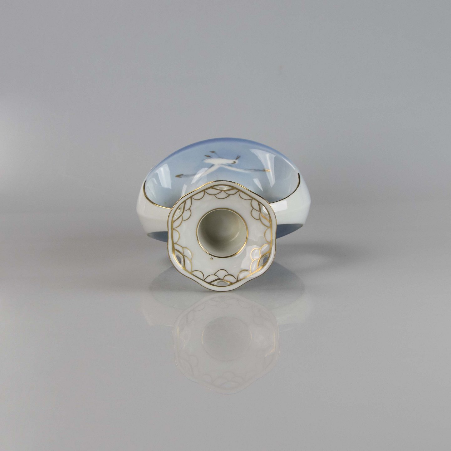 Lysestage fremstillet i porcelæn med skelform i gradueret blå nuancer med guldkant samt motiv af måge.