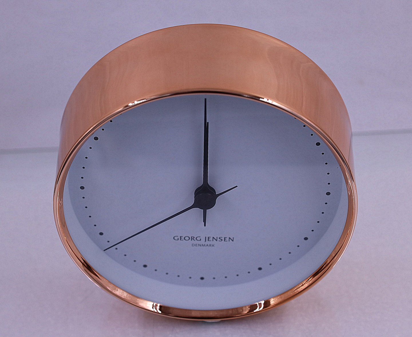 Georg Jensen Living kobber ur. Uret består af en kobber urkasse og en hvid urskive. Uret er fra serien Living , designet 1978 og lanceret 2013. Original kasse medfølger