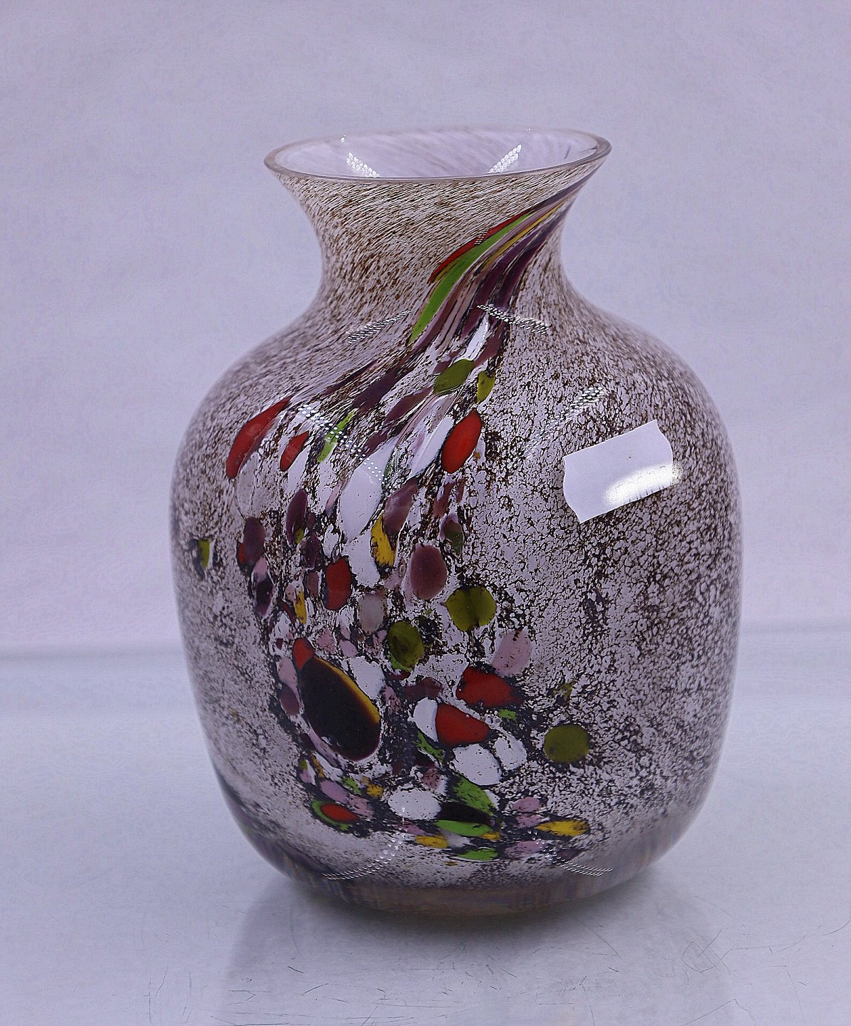 Multifarvet glasvase. Vasen er med indlagt og trukket forskellige farver glas. Vasen er 4-kantet og med udsvejfet hals