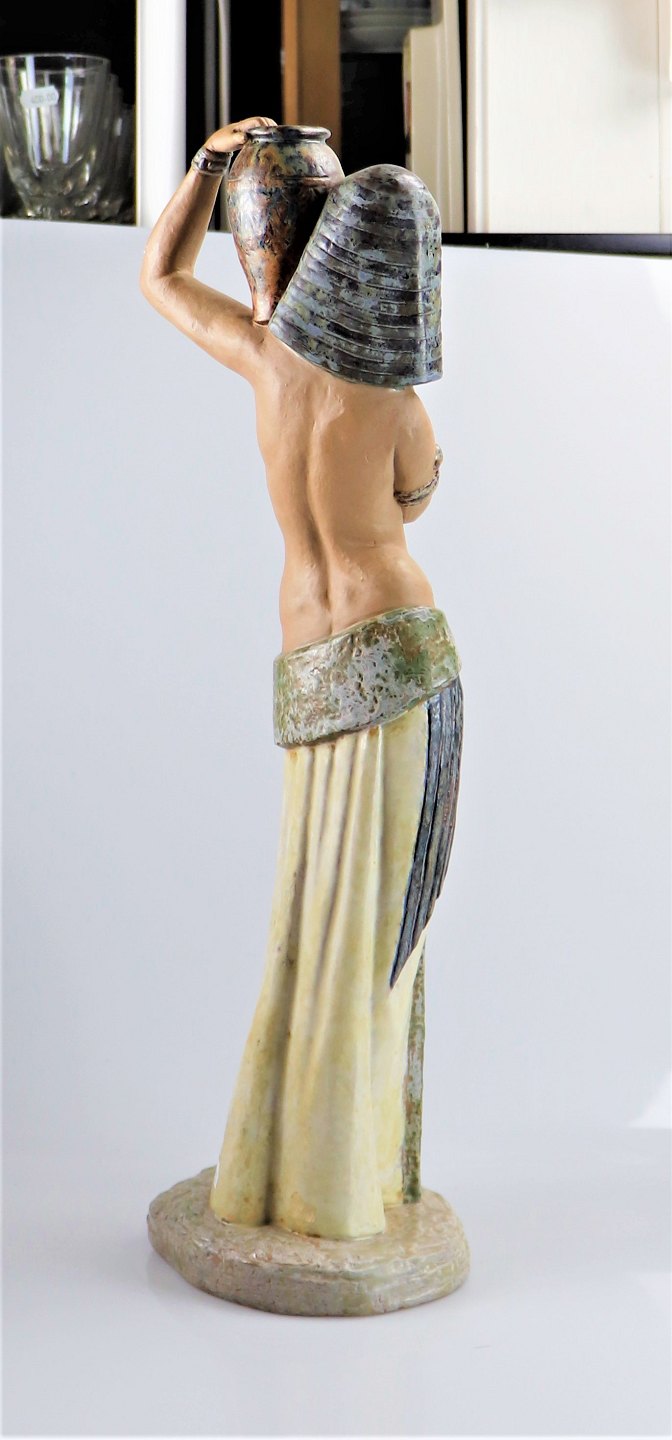 Lerfigur af egyptisk kvinde med krukke på venstre skulder.